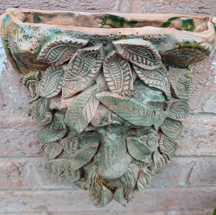 My green man is ceramic and can be wall hung. There are also holes in the bottom for rain to drain out.