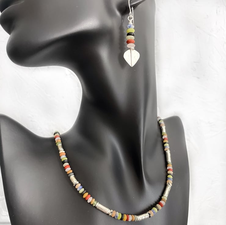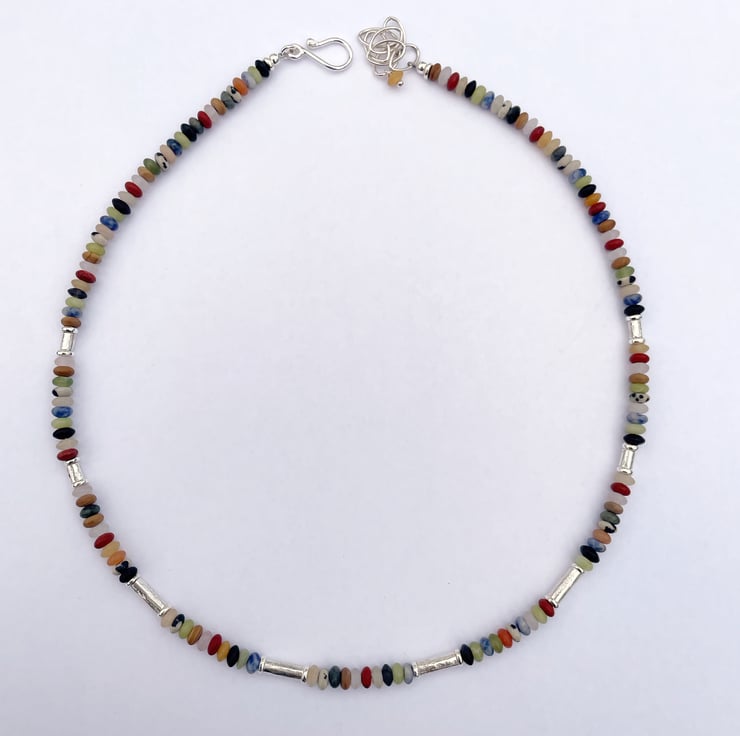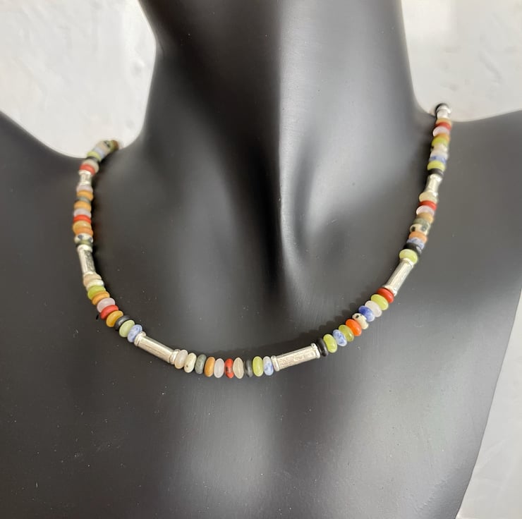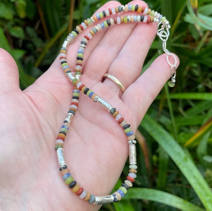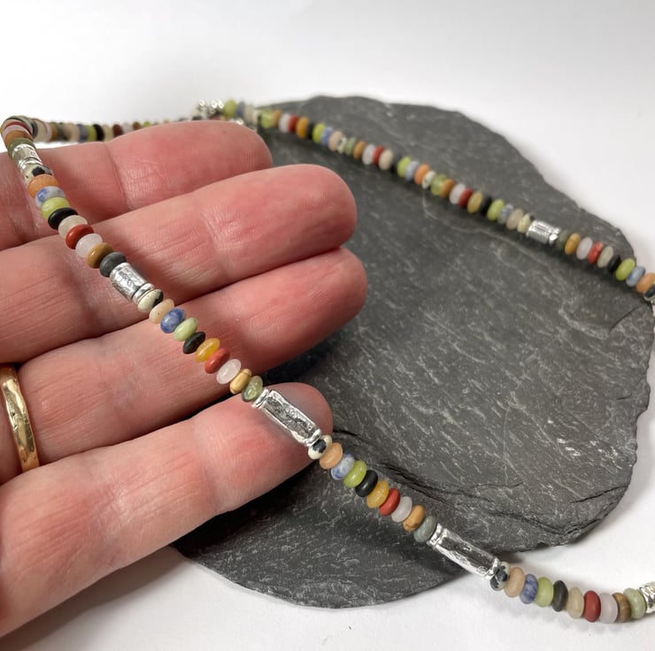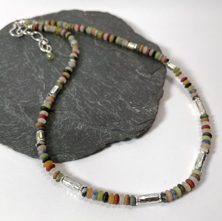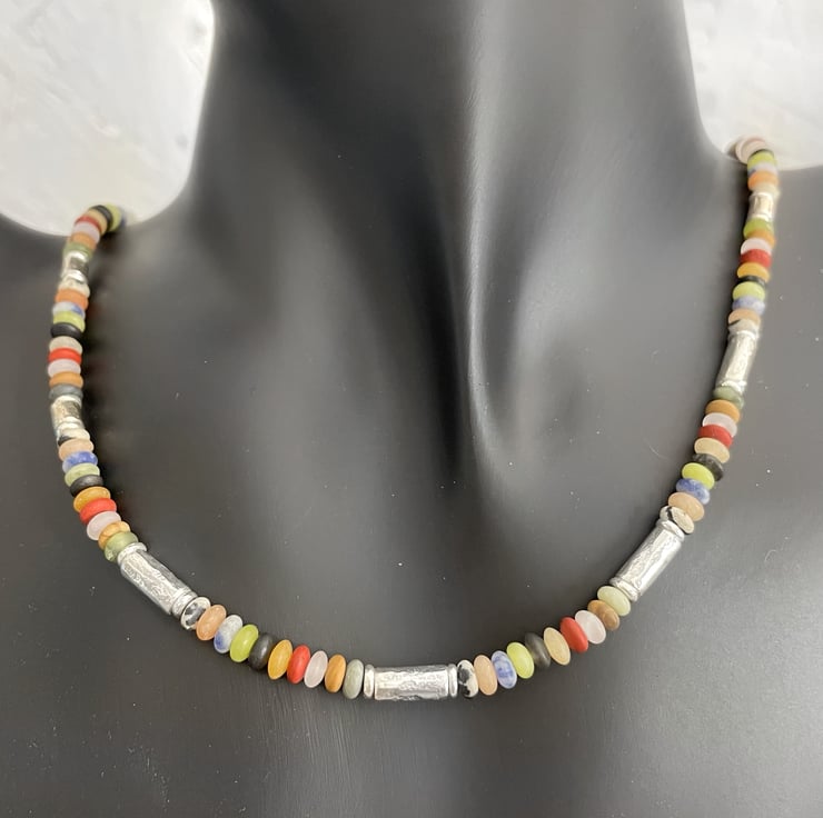 A multicoloured frosted gemstone rondelle bead necklace with hand crafted silver beads and clasp.