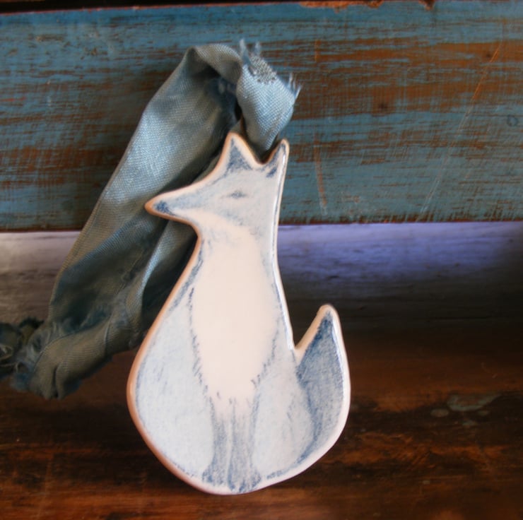 A little fox ceramic to hang on a cupboard or wall or door handle , shaped and cut from Earthenware clay, fired and hand painted in underglaze & fired again for durability. This is not frost proof so please do not hang outside. Comes ready to hang with a sari silk ribbon attached, size approx is 2.5" H x 1.5" W