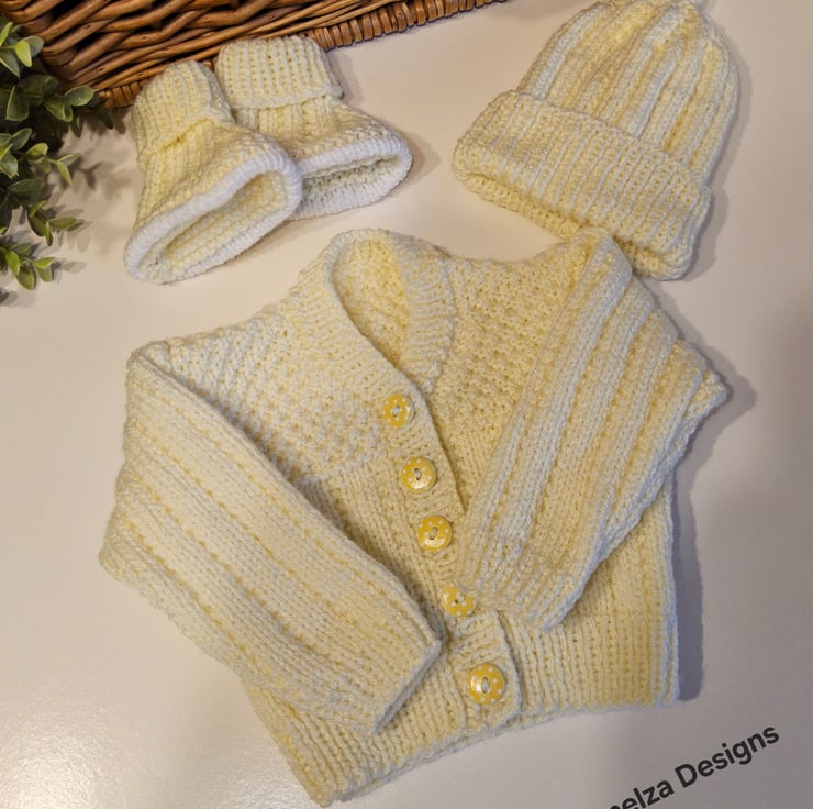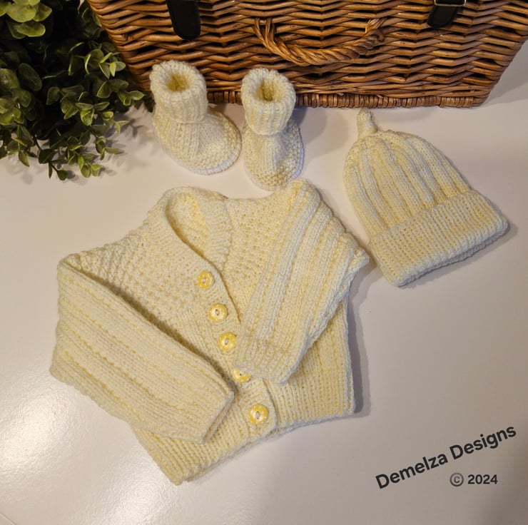 Two lovely soft newborn sets designed and hand knitted in Cornwall by Demelza Designs. The cardigans have genuine wooden buttons on them with a polkadot design.