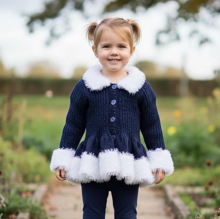 Add a touch of magic to your little one's wardrobe with this hand-knitted sparkly blue cardigan, complete with fluffy white trim. Perfect for Christmas, parties, or cosy winter days, its flared peplum hem and glittery buttons make it truly special.