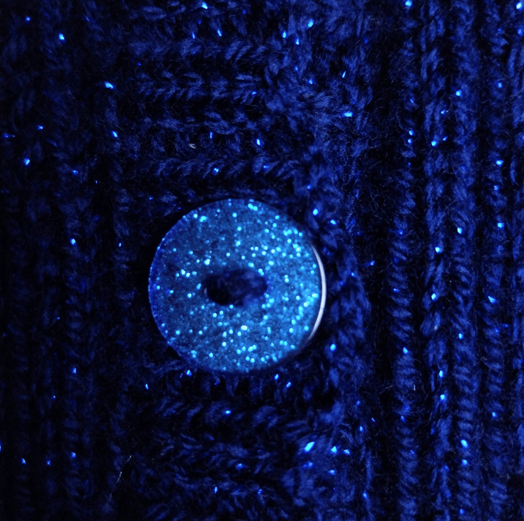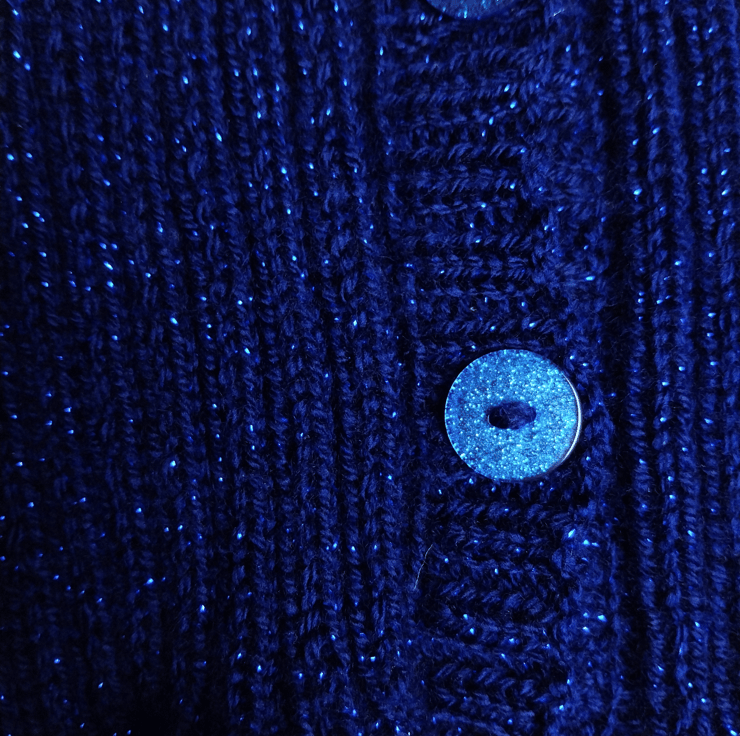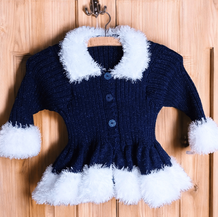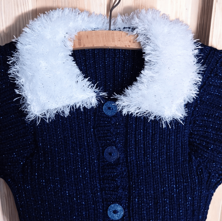 Add a touch of magic to your little one's wardrobe with this hand-knitted sparkly blue cardigan, complete with fluffy white trim. Perfect for Christmas, parties, or cosy winter days, its flared peplum hem and glittery buttons make it truly special.
