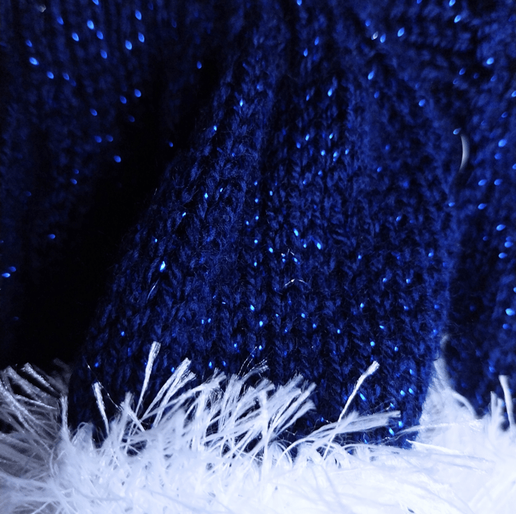 Festive Sparkle: Glittery blue yarn and fluffy white trim bring winter charm.