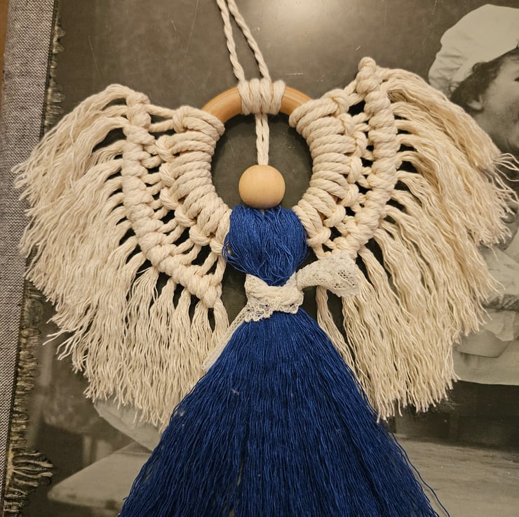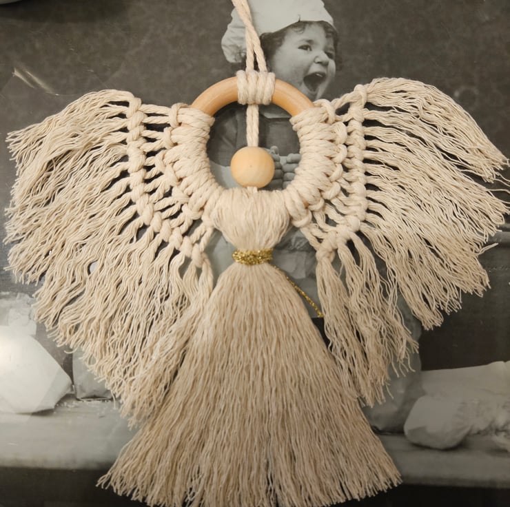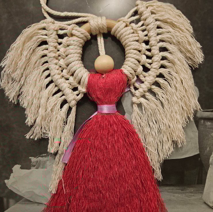 Macrame angel, wall hanging, about 20cm high and 20cm wide, available in few colours:yellow, fusia pink, blue, baby pink, cotton/natural