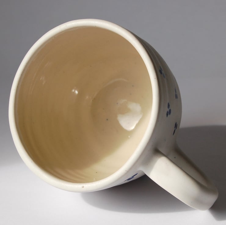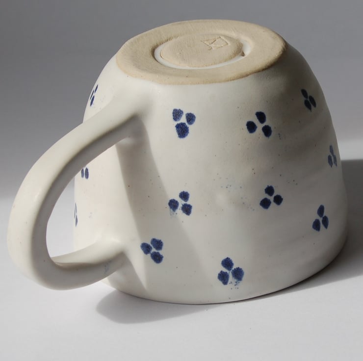 Pretty matt white cup with blue decoration from cobalt brush dots. Homespun style. The wide handle is a feature. Interior glazed in transparent gloss glaze.