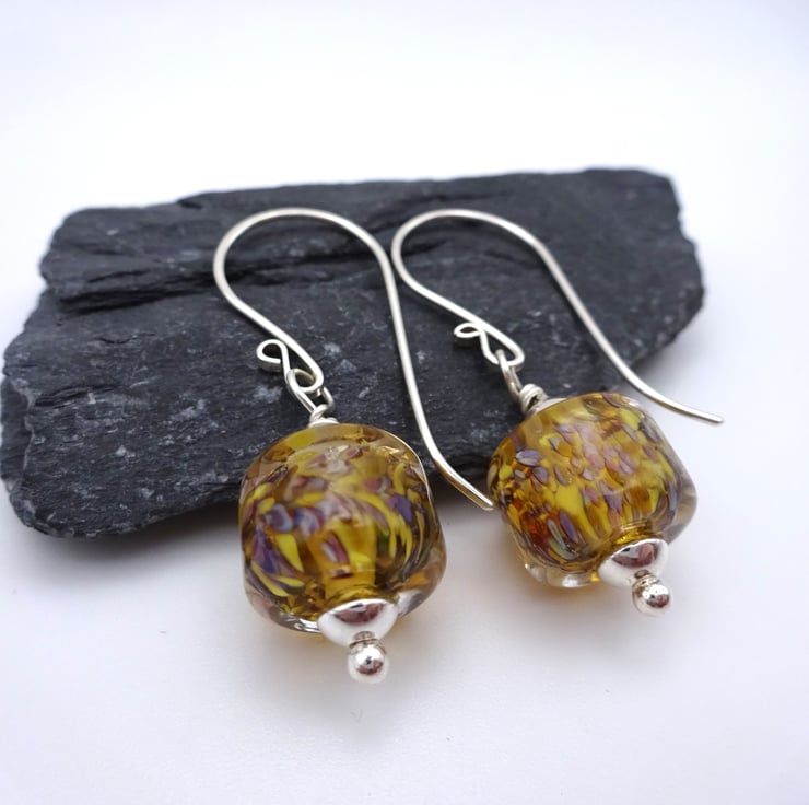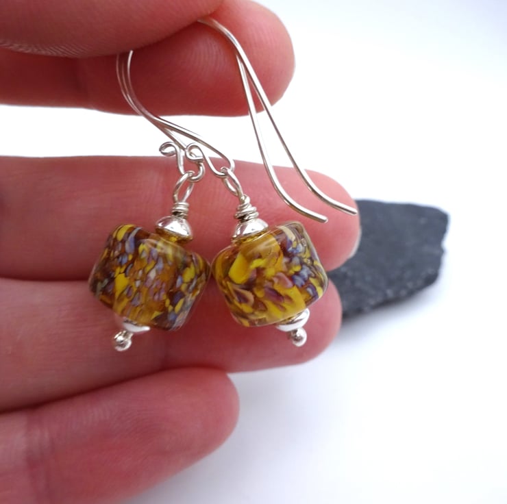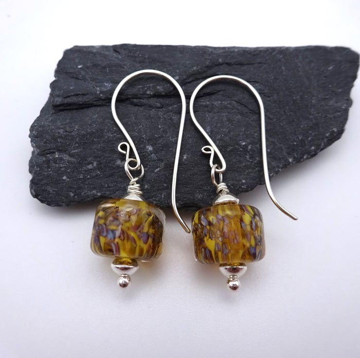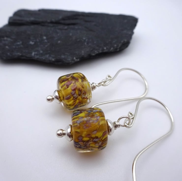 A pair of earrings made with handmade sterling silver ear wires and handmade lampwork glass yellow and brown beads.