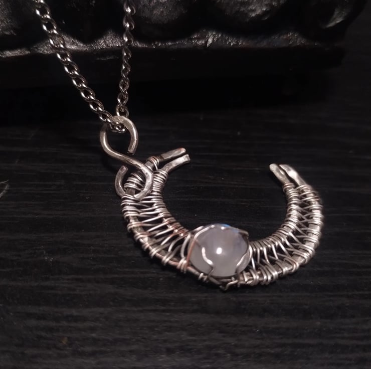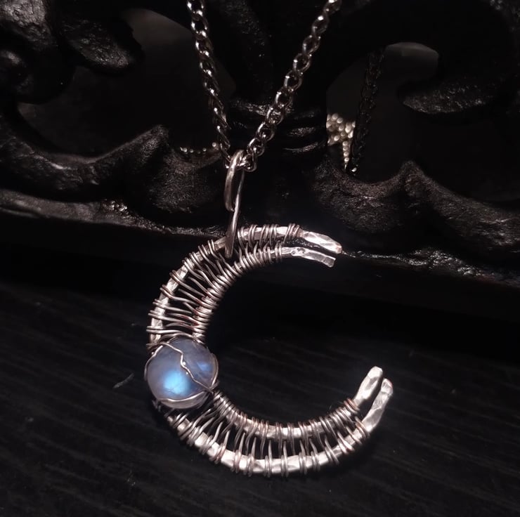 Hand-crafted wirewrapped crescent moon pendant featuring a gorgeous rainbow moonstone with intense blue fire. The pendant is hand-woven out of silver-clad copper wire - unlike silver-plated wires, this material is coated with a thick layer of pure silver. Comes on an 18" chain necklace with a lobster clasp.