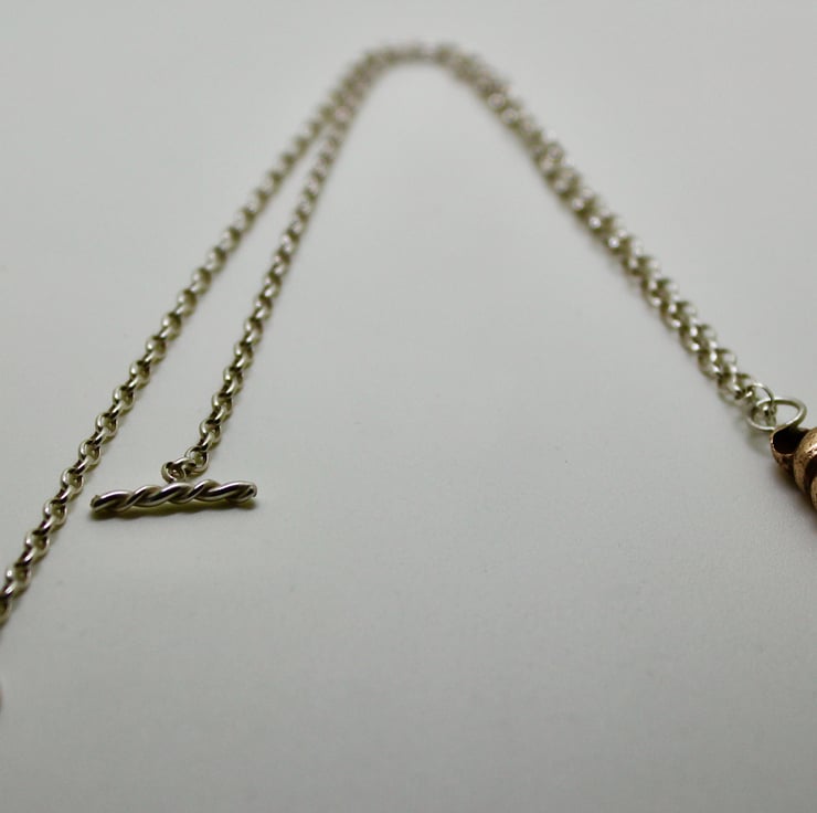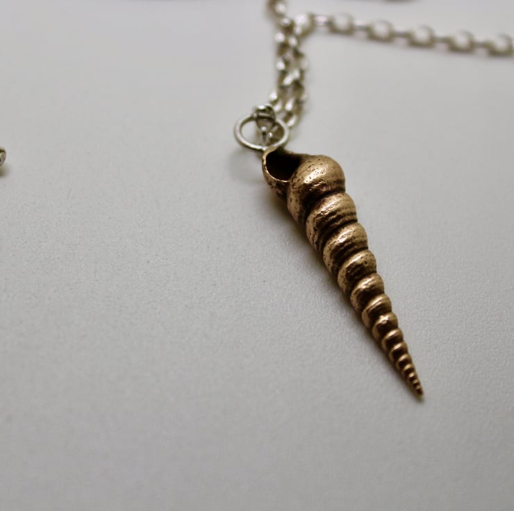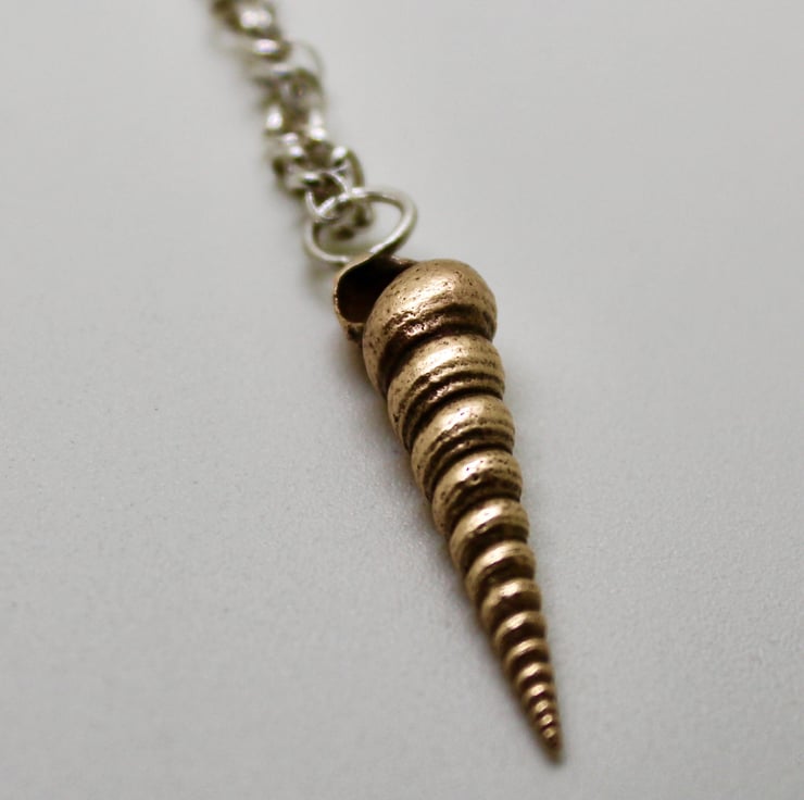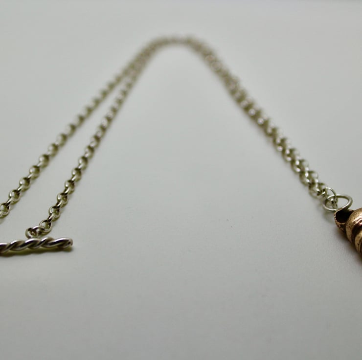 Beautiful blonde bronze twisted shell necklace has an elegant cone shape. It's hanging from a narrow silver belcher chain and has a twisted silver T-bar as the fastening. It makes a lovely 8th wedding present and is the kind of necklace that you'll get a lot of wear out of.