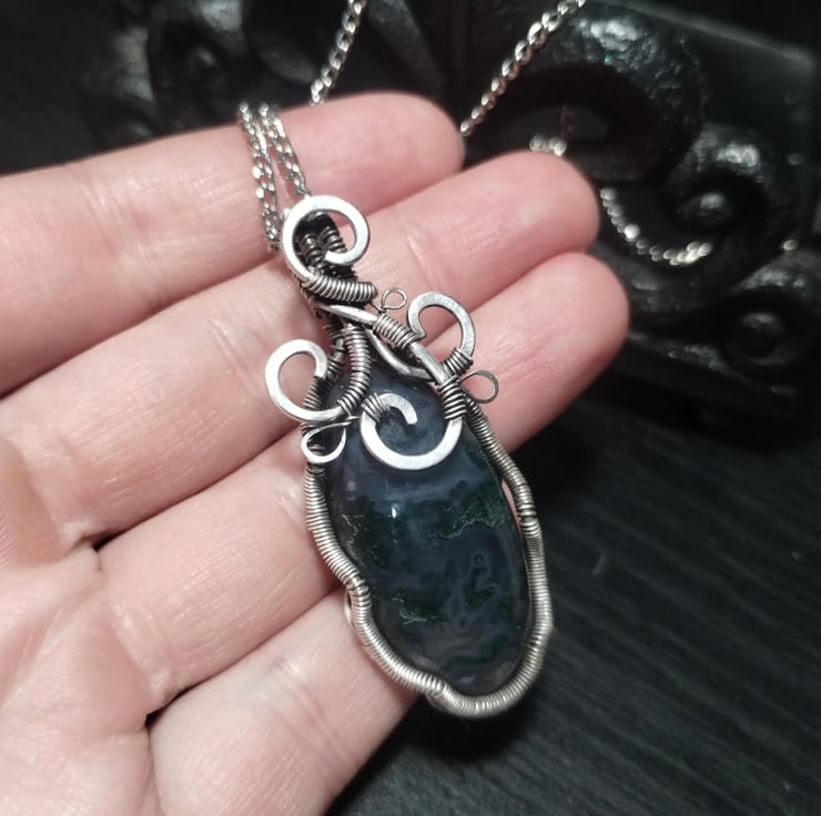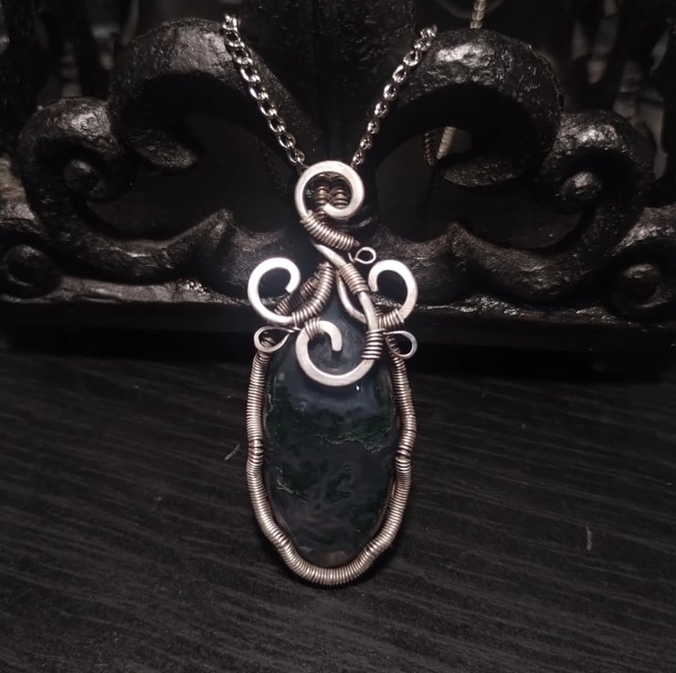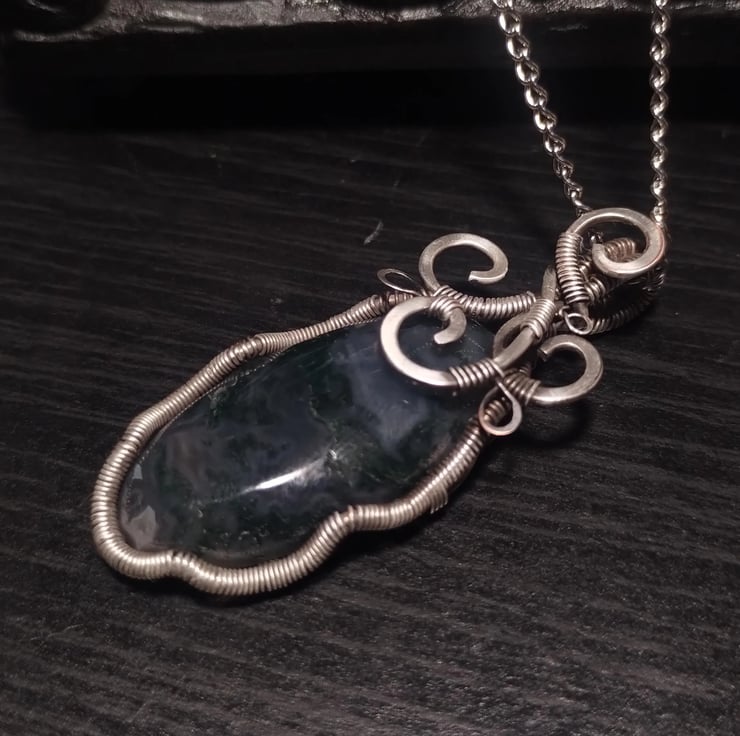 Hand-woven wire-wrapped pendant featuring a large, beautiful moss agate stone. The pendant is crafted out of silver-clad copper wire which is coated with a thick layer of pure silver. Hand-polished and finished with jeweller's wax to prevent tarnish, it hangs on an 18" silver tone chain necklace.