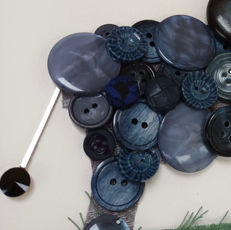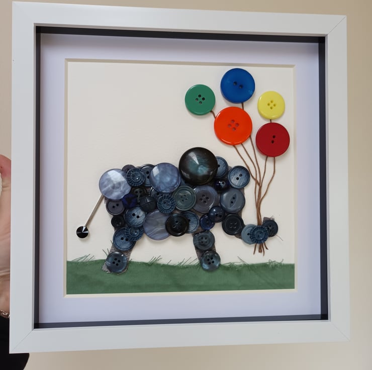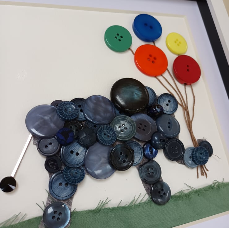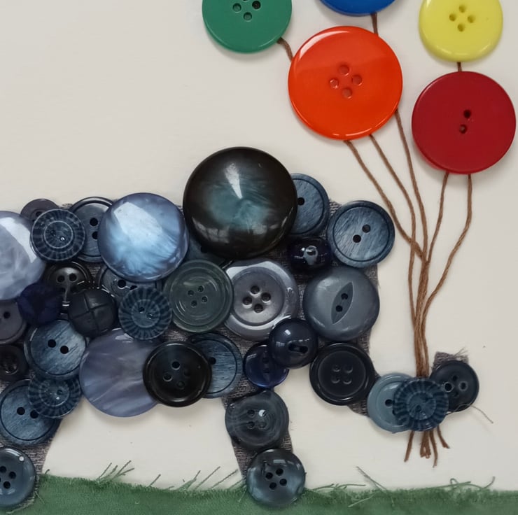 Collage art of a elephant holding a colourful bunch of balloons made with spare buttons.
