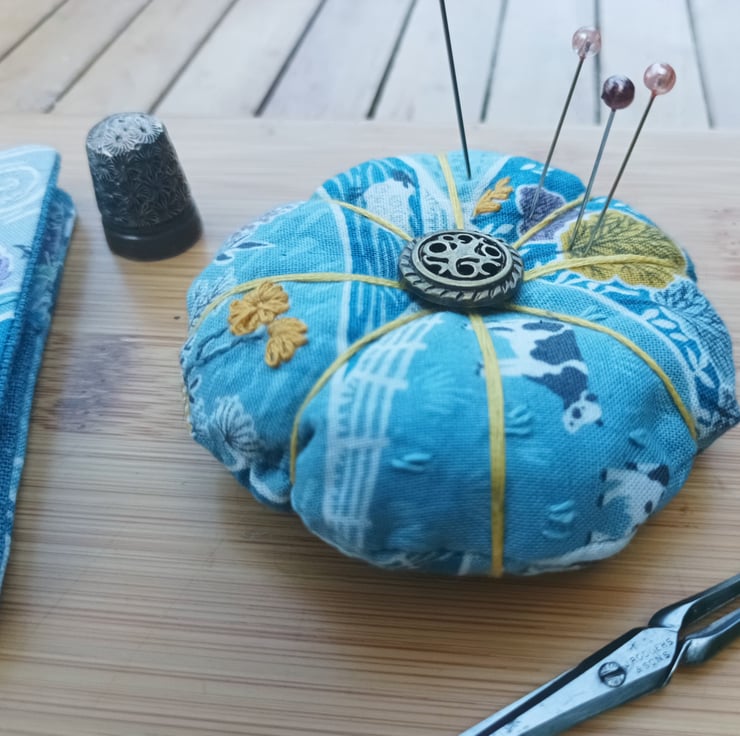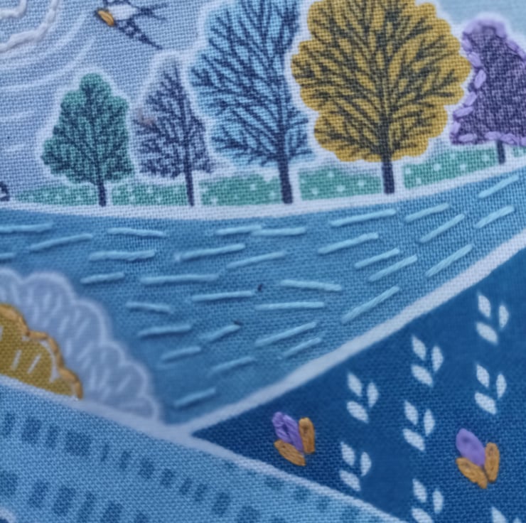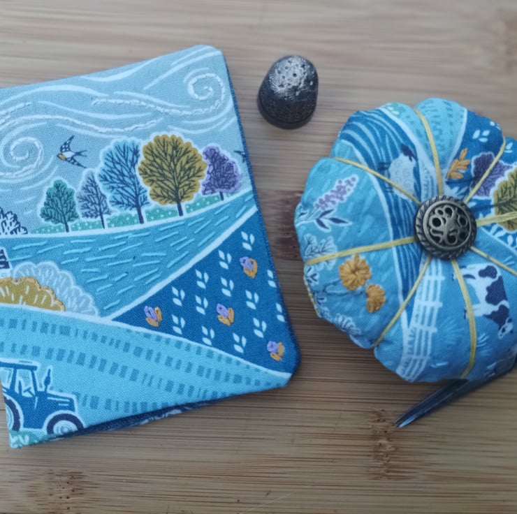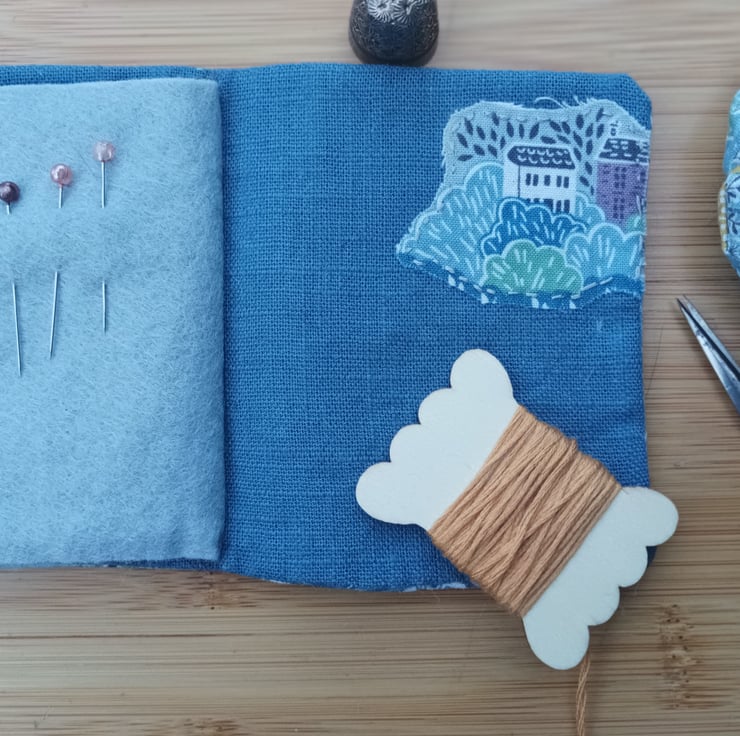 This needle case and matching pin cushion has been hand stitched with care. It is an ideal gift for that creative person in your life and would enhance any creative space. It has a lovely image of a landscape which I have creatively embroider to add interest and texture.