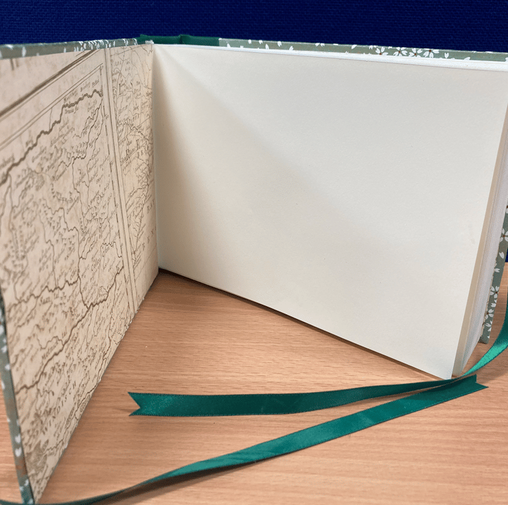 This 92 page bookblock has been bound using gorgeous paper from Shepherds Bookbinders. The paper weight is 140gsm, suitable for sketching, or just taking notes. The end papers on the inside of the front and back covers have a contrasting sturdy map paper. There is a thin green ribbon marker.
