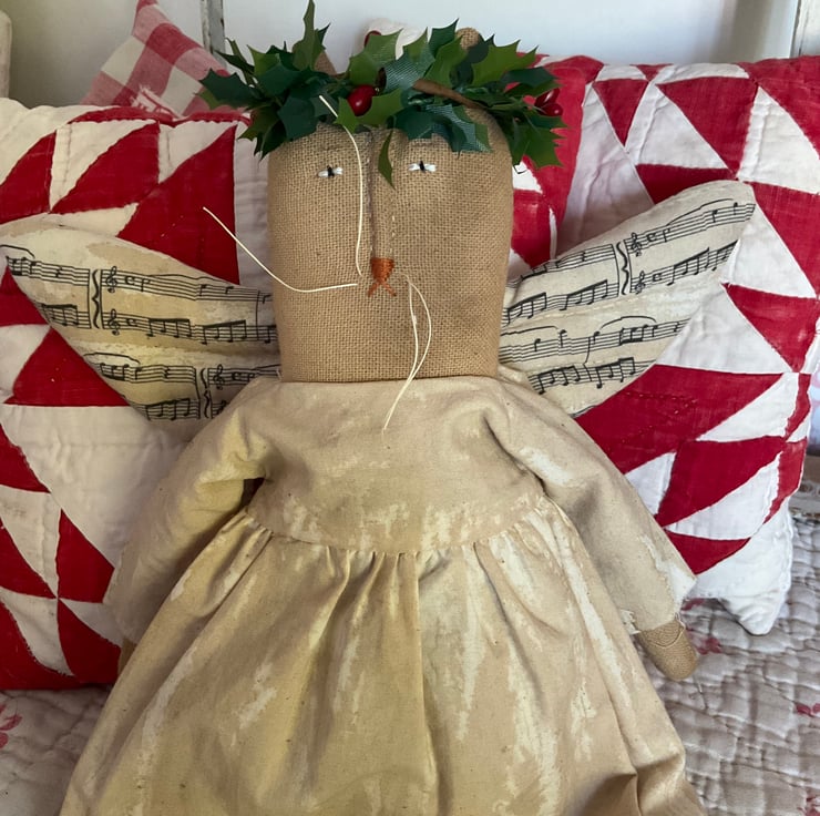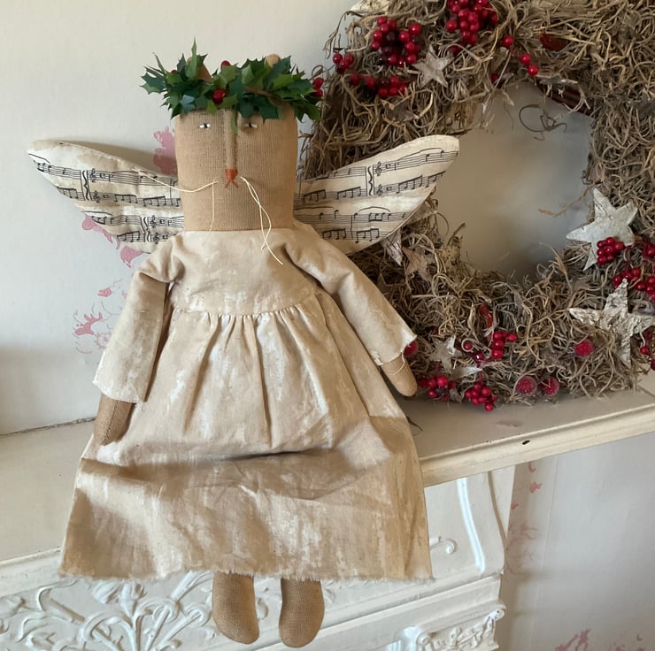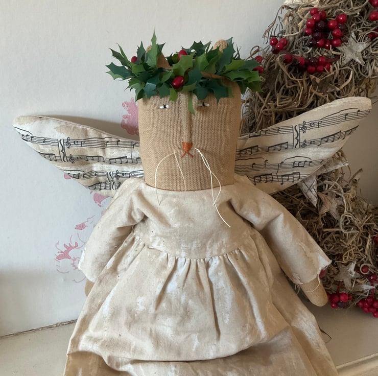 Her dress and wings are made from walnut stained calico. Her dress edges are left raw. The wings have been printed with sheet music. Her face is hand stitched. Her faux holly halo intertwined with pip berries is easily removed, so you can display Holly all year round