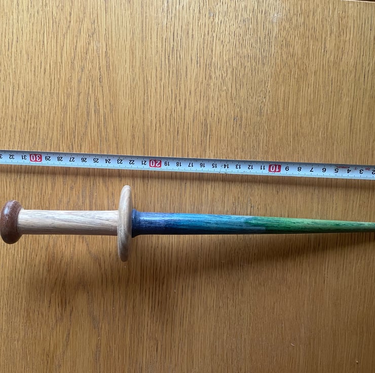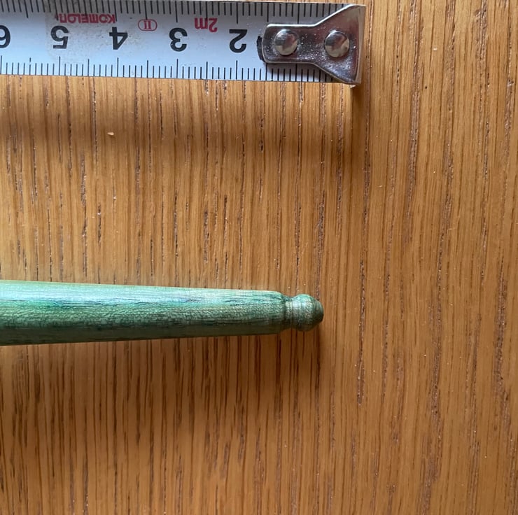 This one at 32 cm and a 6cm whorl has been given a multi shaded staff finished with quality waxes. It weights 66 grams . The basic shape is similar to that of a drop or supported spindle so I added a point to the handle and a groove to the tip I also think it could be used as a distaff?
