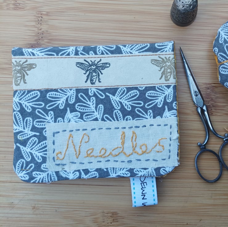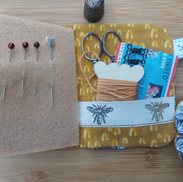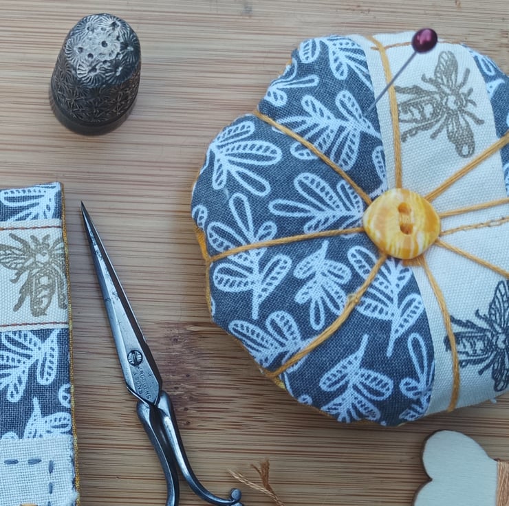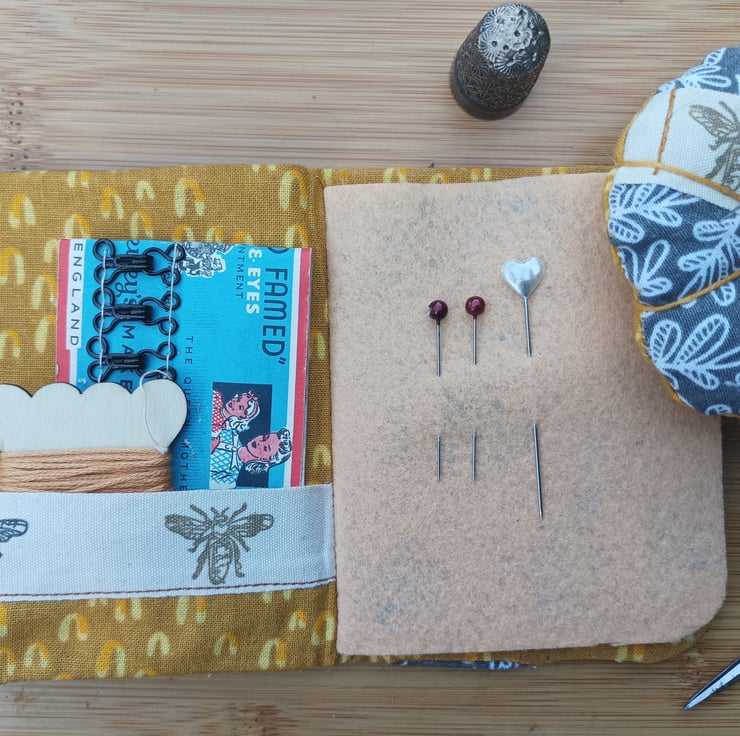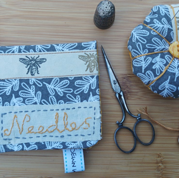 Hand finished needlecase and matching pin cushion finishes with hand sewn detail. Made from sewing scraps and found ribbon. The pin cushion is filled with ground walnut shell to condition your needles as you use it. This beautiful set would look great in any craft space as well as being very useful. SCISSORS ARE NOT INCLUDED.