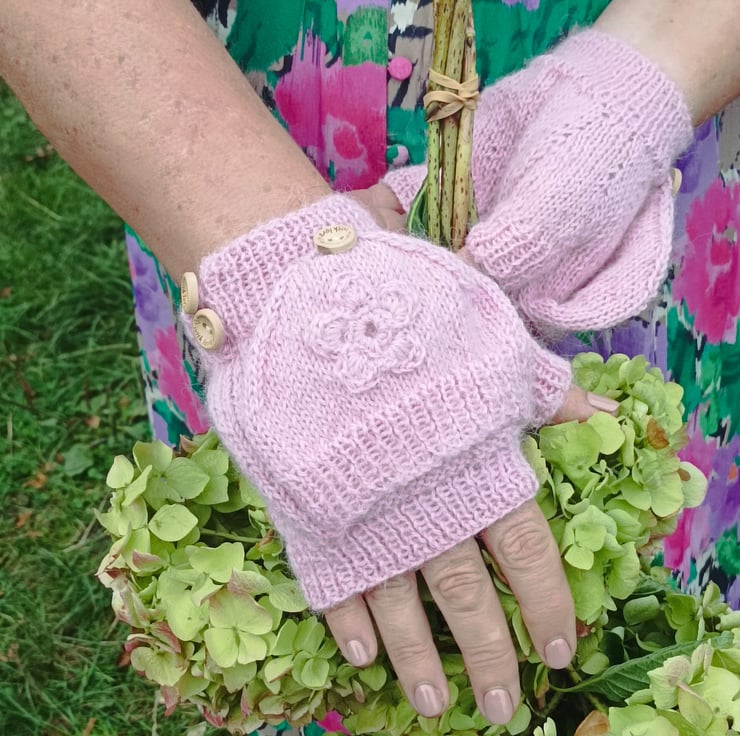 Hand knitted alpaca gloves with flaps, perfect for those cold days. Knitted on four needles to minimize seams and finished with a handmade with love in button. The yarn is highest quality 4ply weight alpaca. The flap folds over the fingers for those extra cold days.