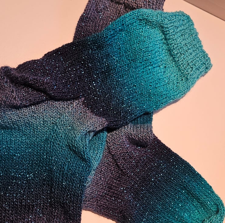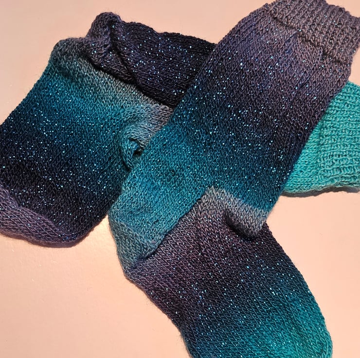 A pair of hand knitted socks in shades of blues with a subtle sparkle. Size UK5-8. Great for keeping your toes warm in the colder weather.