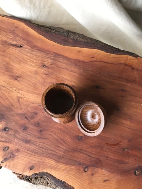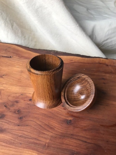 A delightful lidded pot turned from Teak (an old snooker table leg)
