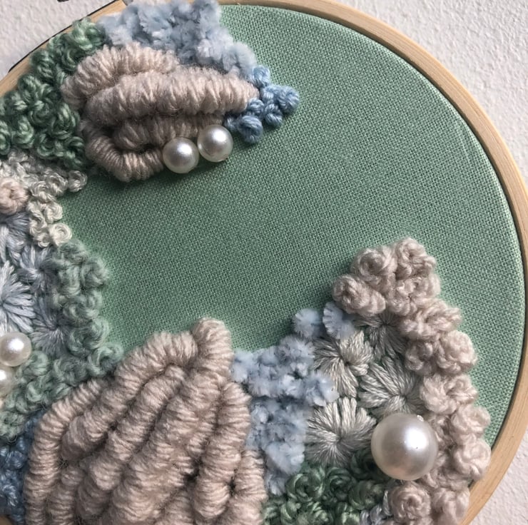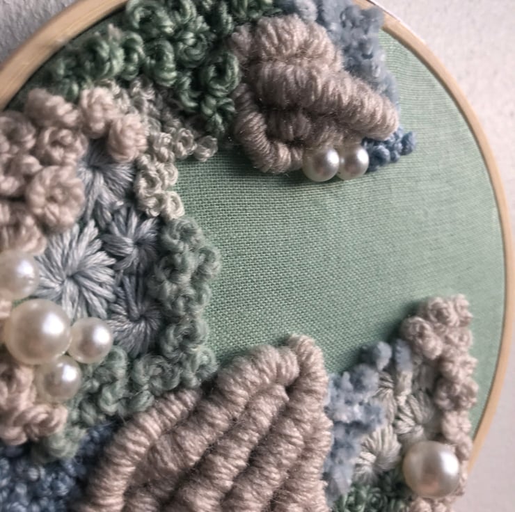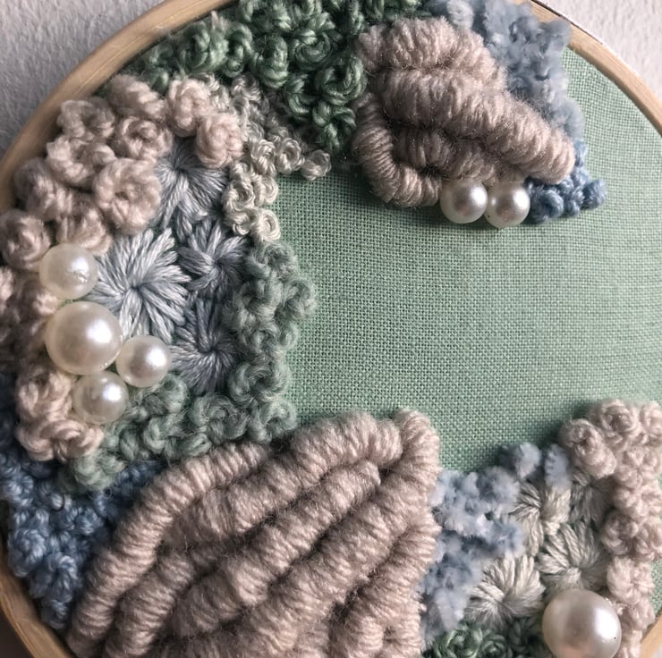 Seashore a 4 inch one of a kind hand embroidered home decor art piece. Embroidery thread, yarn and beads have been hand stitched onto a pale green fabric in an abstract pattern. This has created a piece which is both eye catching and unique a perfect addition to any home