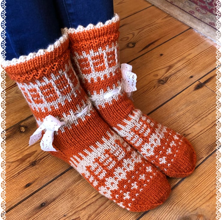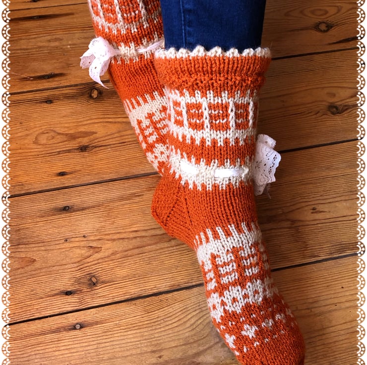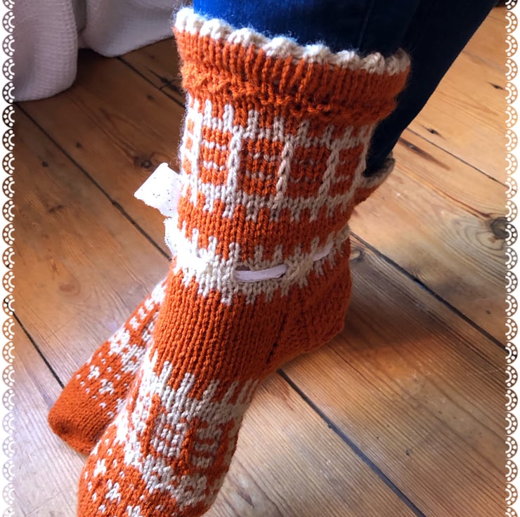 Hand knitted using DK acrylic yarns, burnt orange & cream. Machine washable on hand wash cycle dry flat.