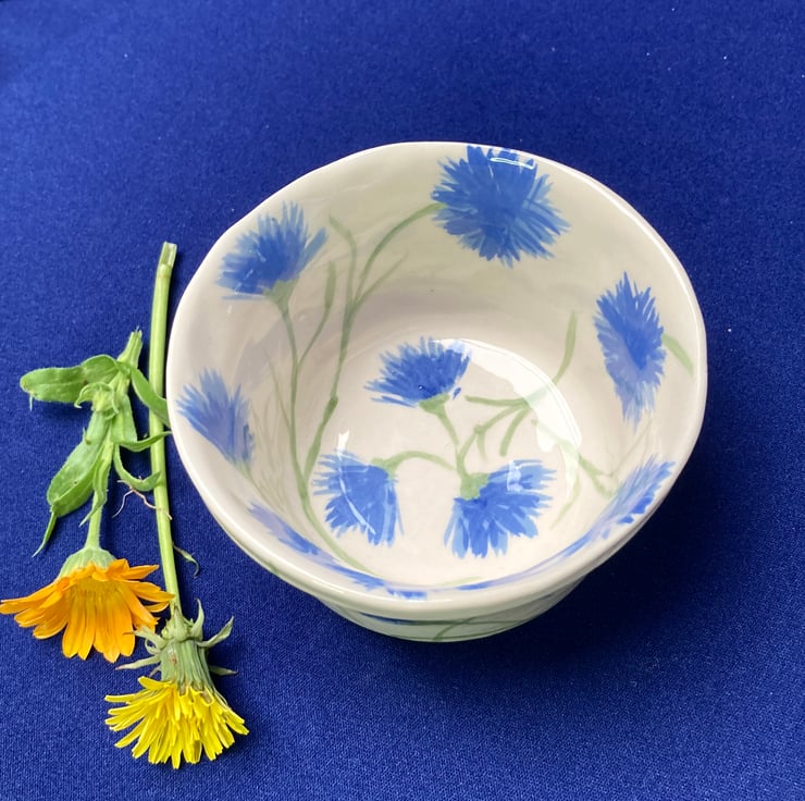 Hand built earthenware with loose painted cornflower design makes these charming little pots unique and collectible as well as useful. With deep sides and internal diameter of 7cm, it can be used for dips and sauces, tapas or sugar. Alternatively it can take a pillar candle .