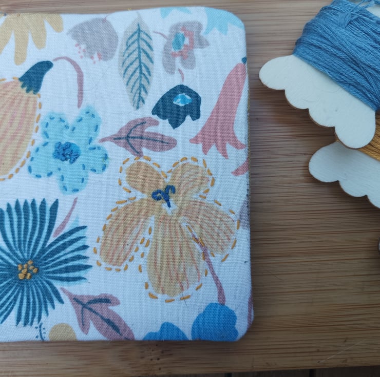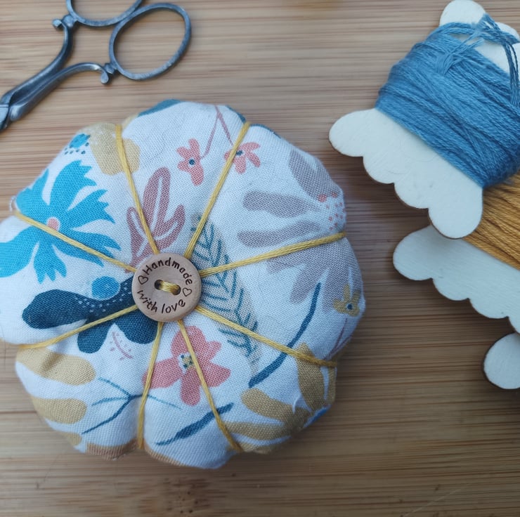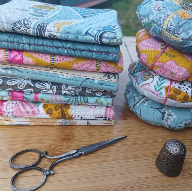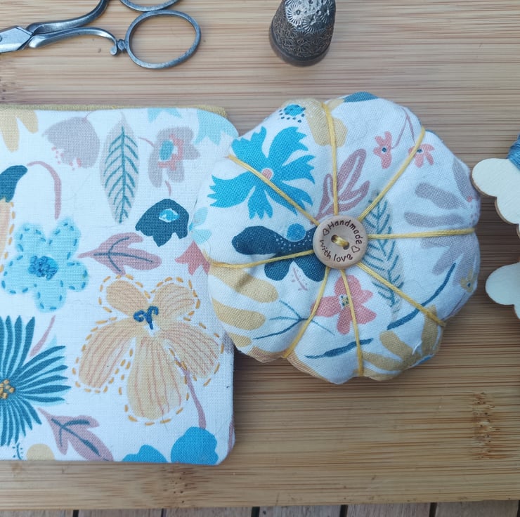 Hand finished needlecase and matching pin cushion finishes with hand sewn detail. Made from sewing scraps and found ribbon. The pin cushion is filled with ground walnut shell to condition your needles as you use it. This beautiful set would look great in any craft space as well as being very useful. SCISSORS ARE NOT INCLUDED.