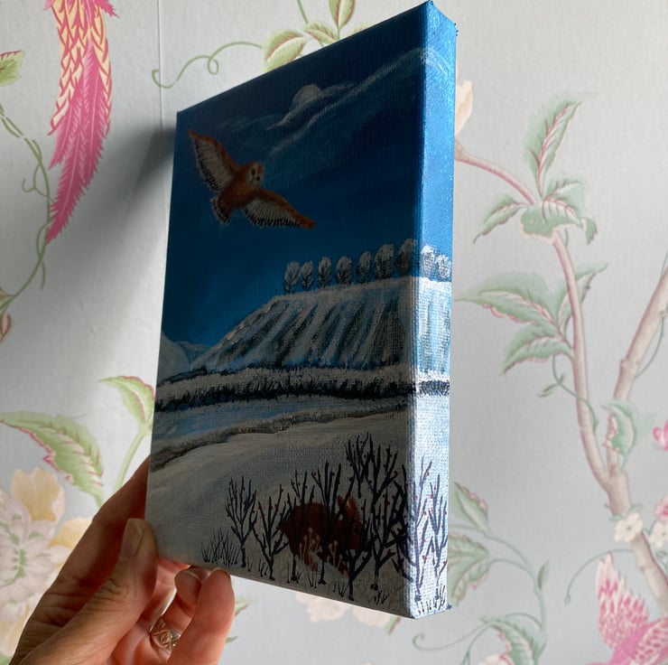 This original artwork is hand painted onto prepared canvas using acrylic paint. It is a winter scene with a hunting owl and a rabbit ‘frozen’ in the undergrowth, and the sides continue the art around the edge.