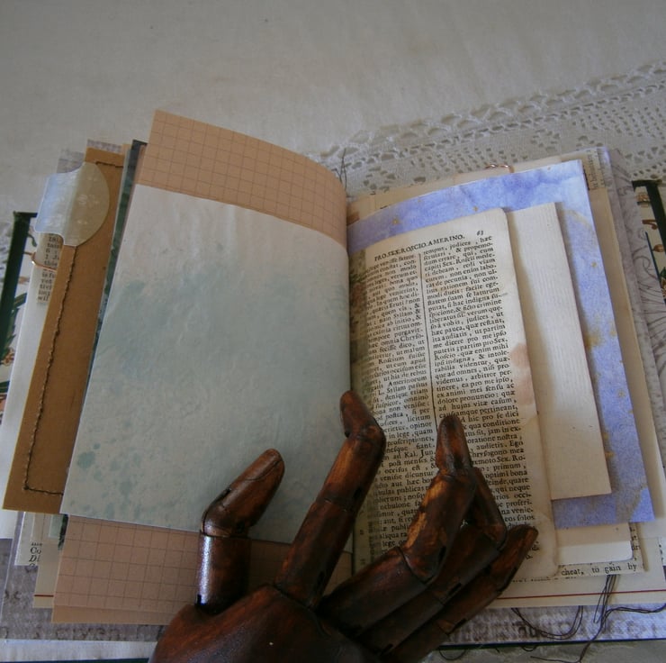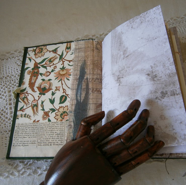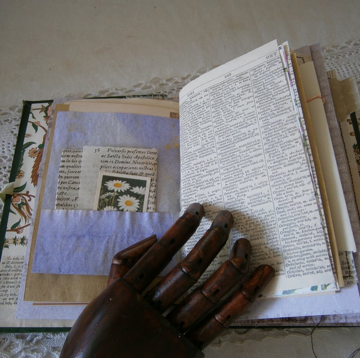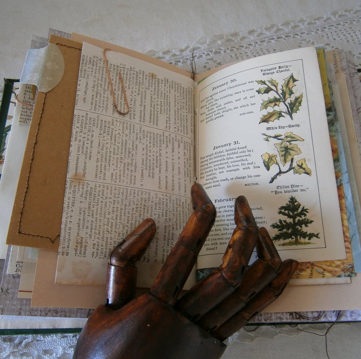 Included within the journal are: Vintage/Antique book pages - they go from the 1970s to the early 1800s some even earlier. I have included a few tea/cigarette cards about flowers, a few pieces of paper for collage work in the journal, a couple of tags that are plain as well as two journal cards - all for you to collage on and make your own. I've also included a small book mark for you to use to save your place when working.
