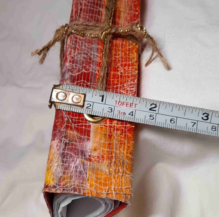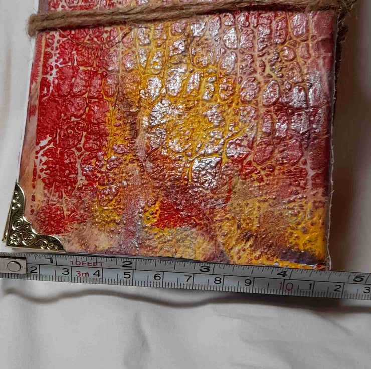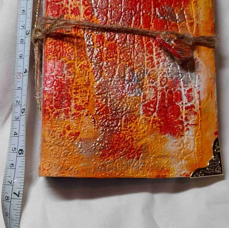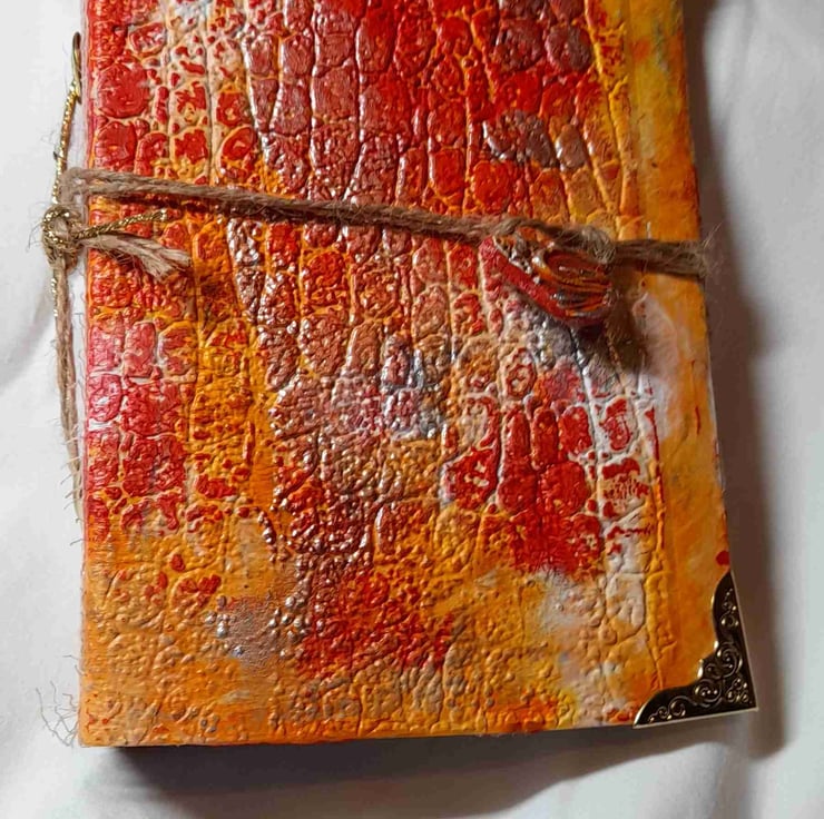 Beautiful hand crafted embossed journals, the cover has a reptile skin pattern, using card, paper, acrylic paint, metal eyelets and corners and natural twine with a bit of sparkle.