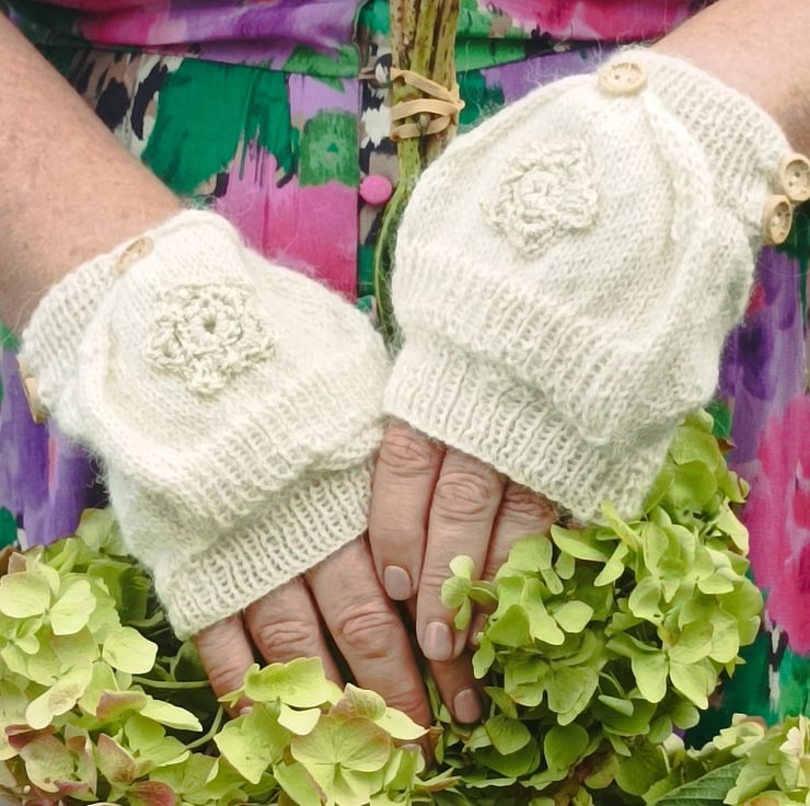 Hand knitted alpaca gloves with flaps, perfect for those cold days. Knitted on four needles to minimize seams and finished with a handmade with love in button. The yarn is highest quality 4ply weight alpaca. The flap folds over the fingers for those extra cold days.