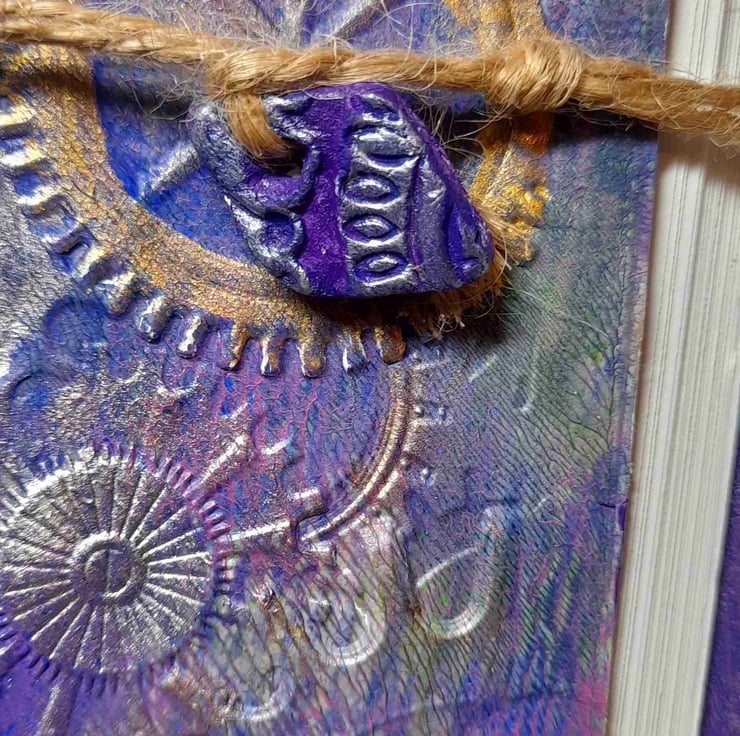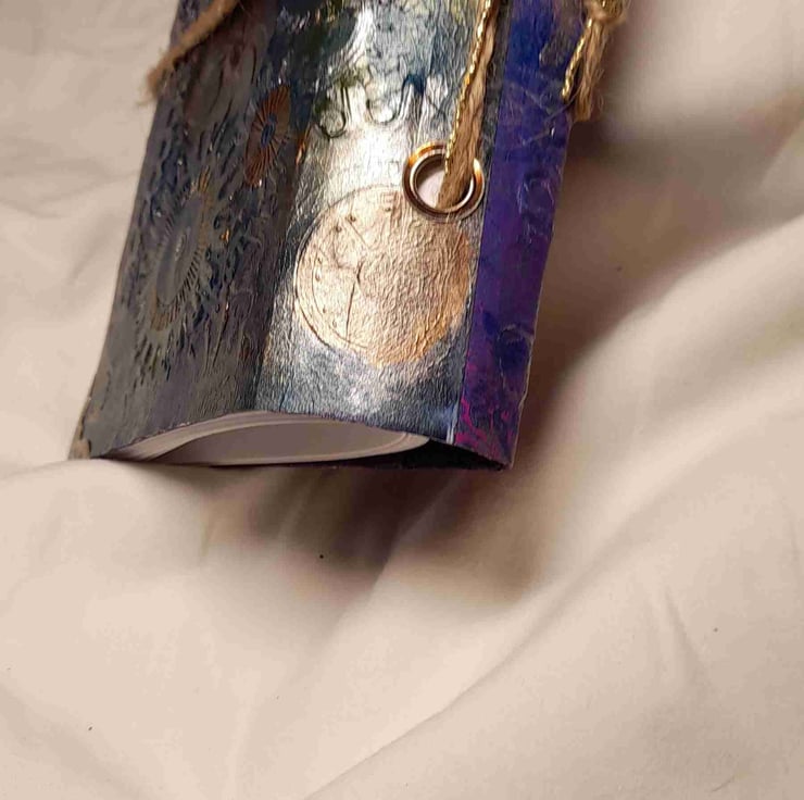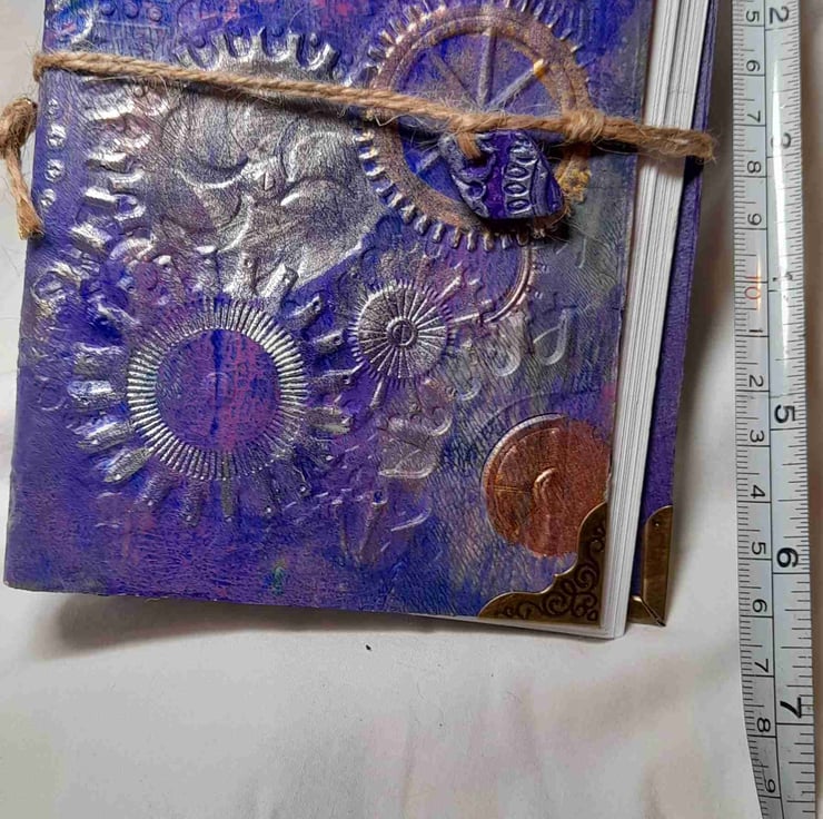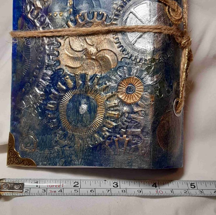 Beautiful hand crafted embossed journals, this range has a steam punk look with cogs and wheels. Using card, paper, acrylic paint metal eyelets and corners and natural twine with a bit of sparkle