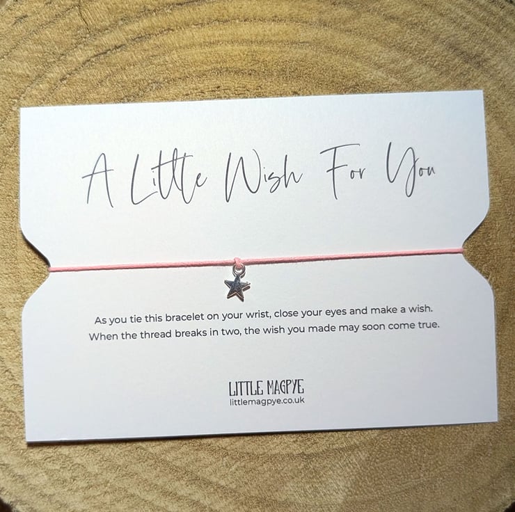Attached to a smooth, strong white card with a verse printed in crisp black ink, wish bracelets are designed to be tied onto the wrist and not removed until the cord snaps. I have a rainbow of strong waxed cotton cord colours for you to choose from, along with your choice of a nickel, lead and cadmium safe silver-plated star, heart or horseshoe charm.