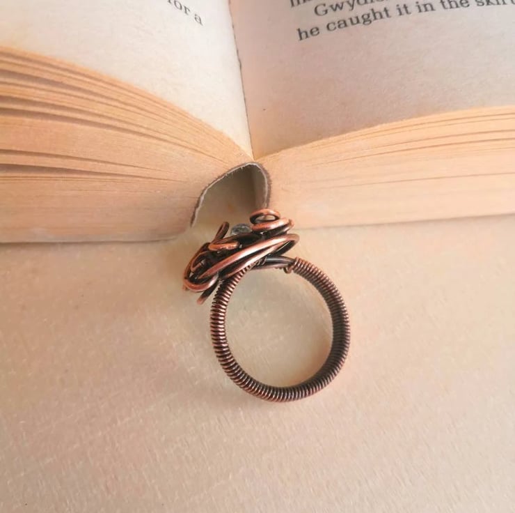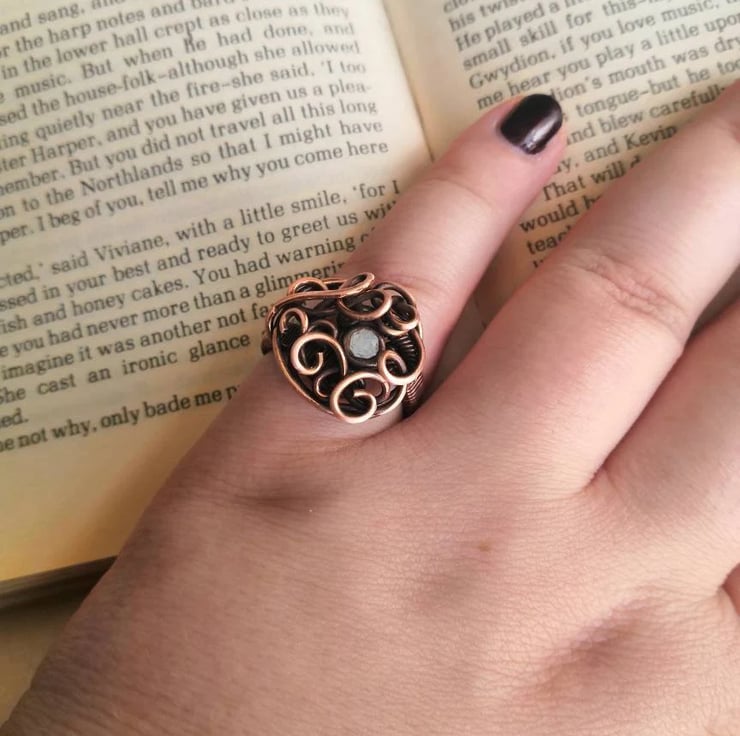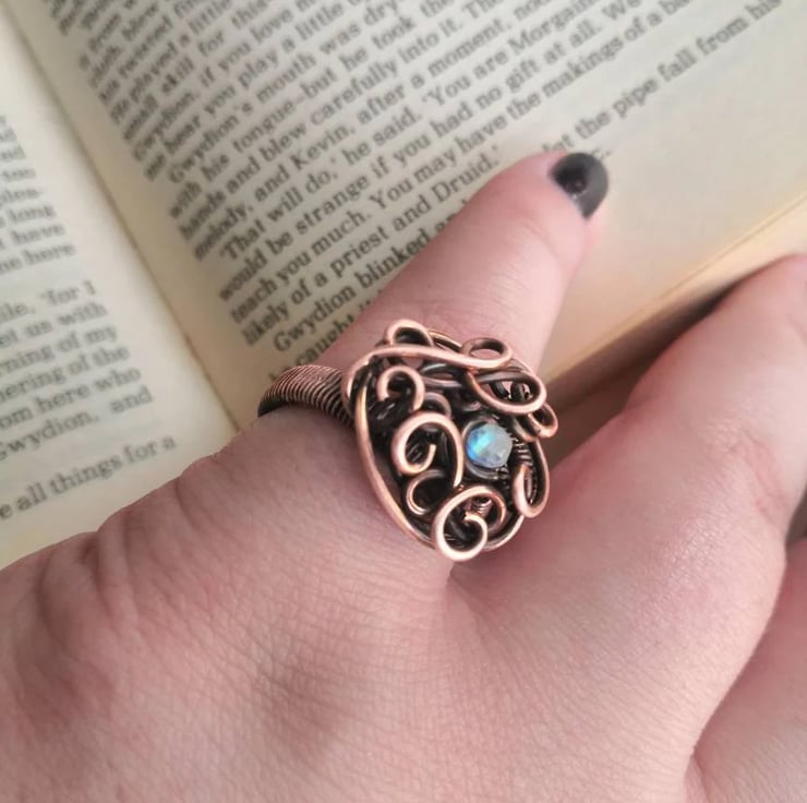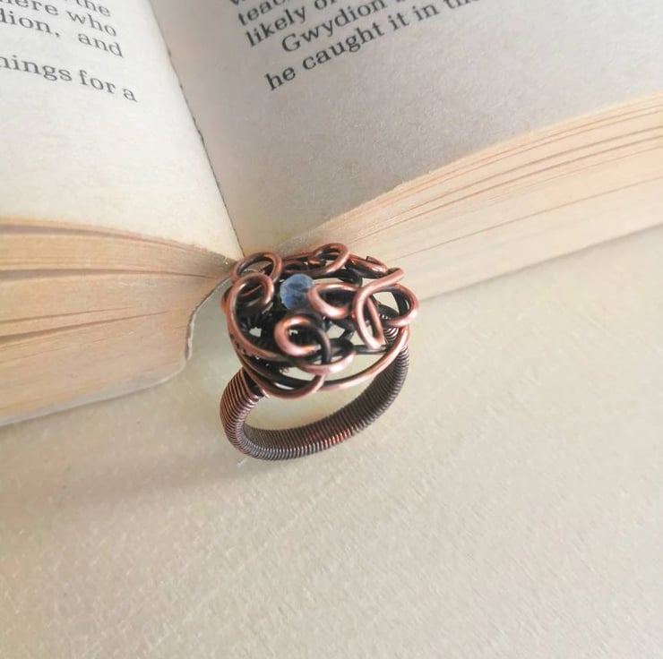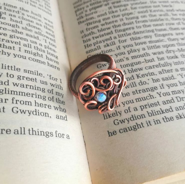 Hand-woven antiqued polished copper ring in UK size Q, featuring a tiny yet truly spectacular faceted rainbow moonstone nestled among the elegant swirls. The stone has an incredibly bright bluish-yellow fire which makes it stand out and give life to the piece.
