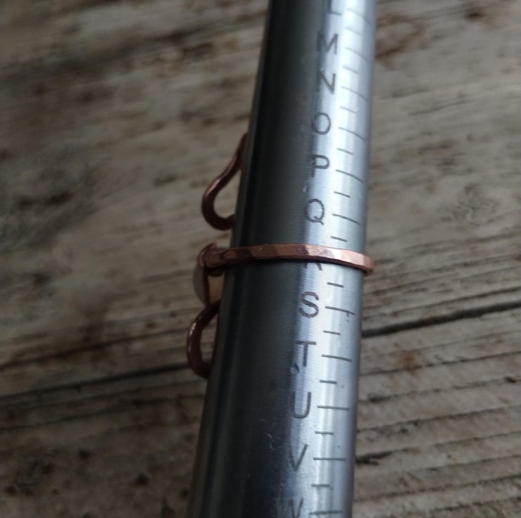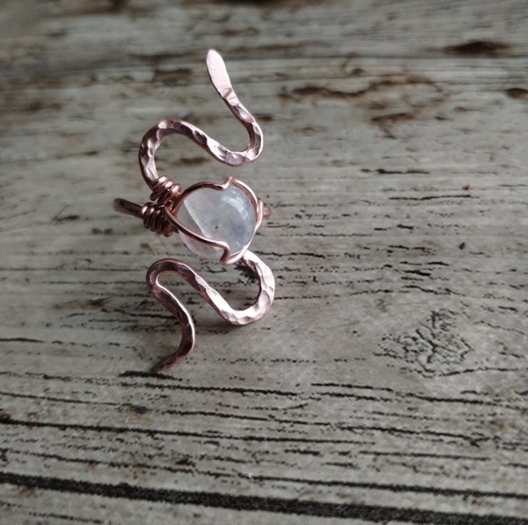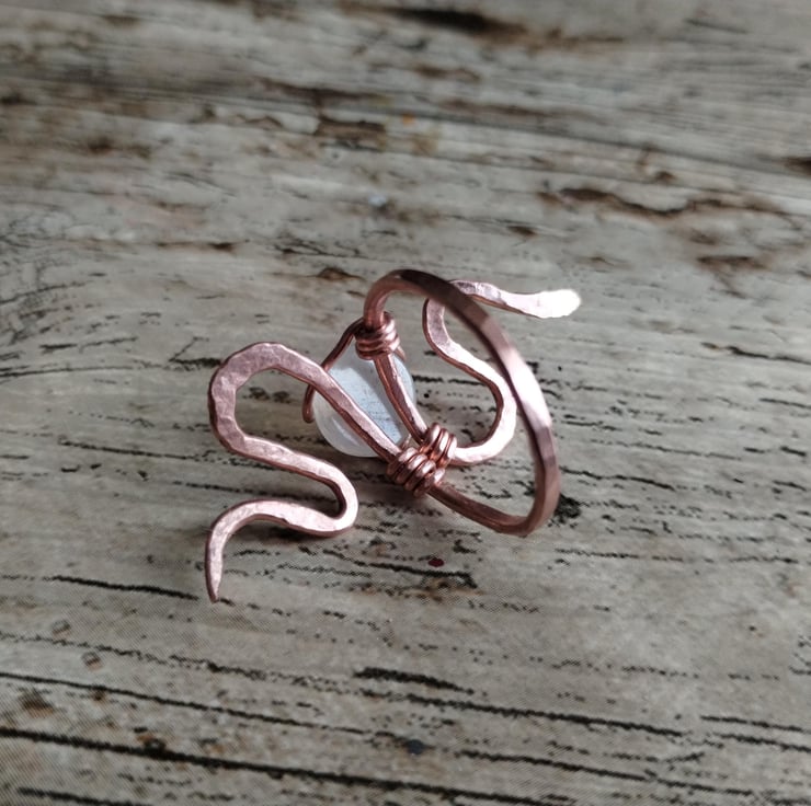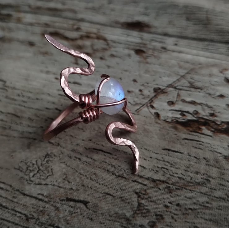 Pure copper ring in a snake design, featuring a fiery blue moonstone. Polished to a high shine and finished with jeweller's wax for tarnish protection. UK size R-R 1/2.