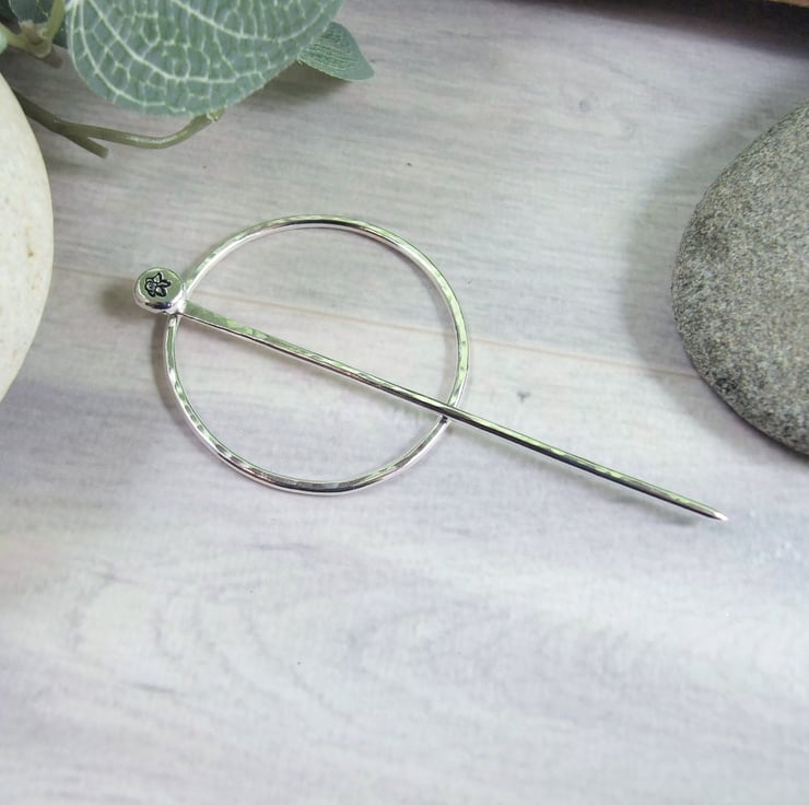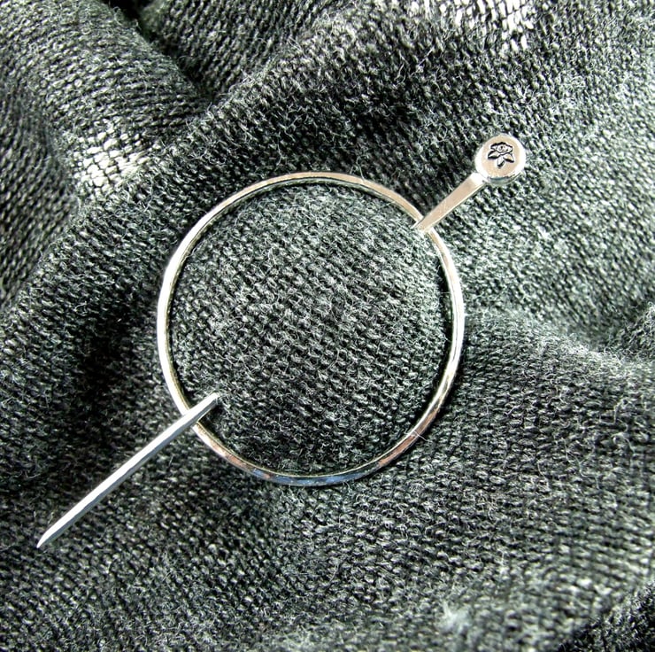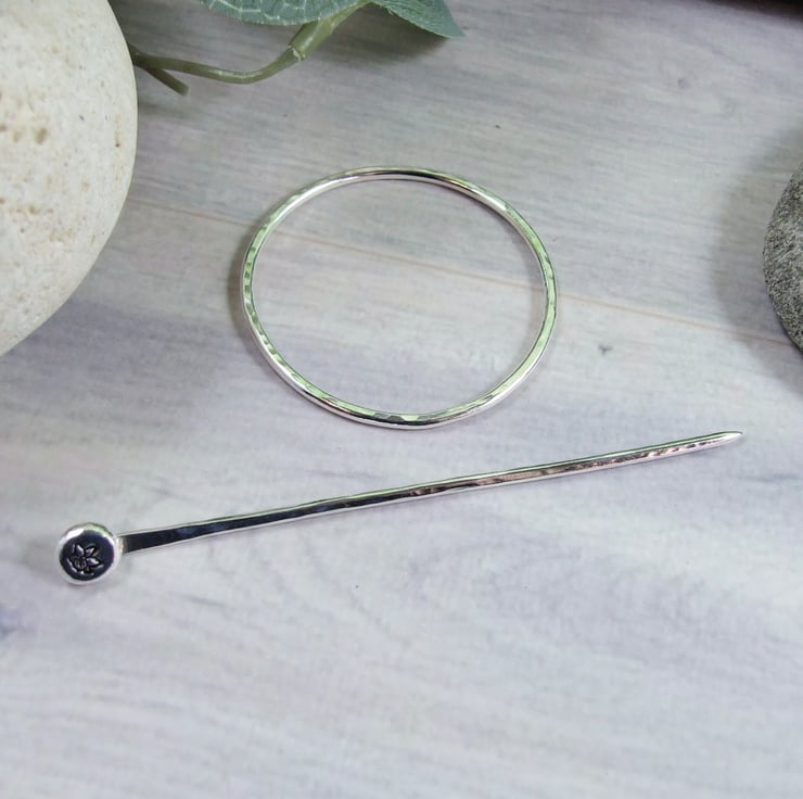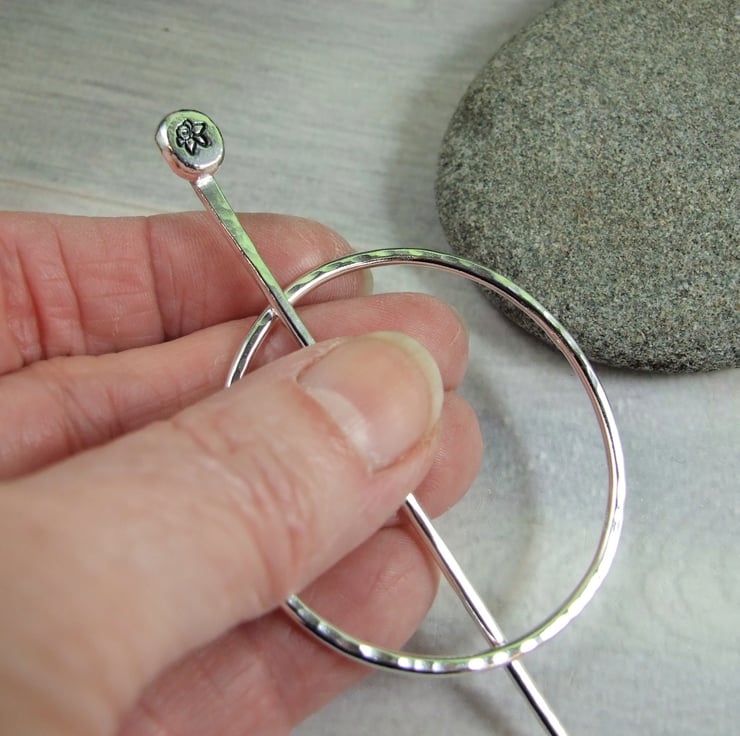 I have made the ring from 2mm solid Sterling Silver wire with hammered texture. The pin is made from 2mm wire, shaped with a rounded blunt point at one end. At the other I have added a small silver pebble created from molten silver slightly flattened and stamped with a daffodil flower.