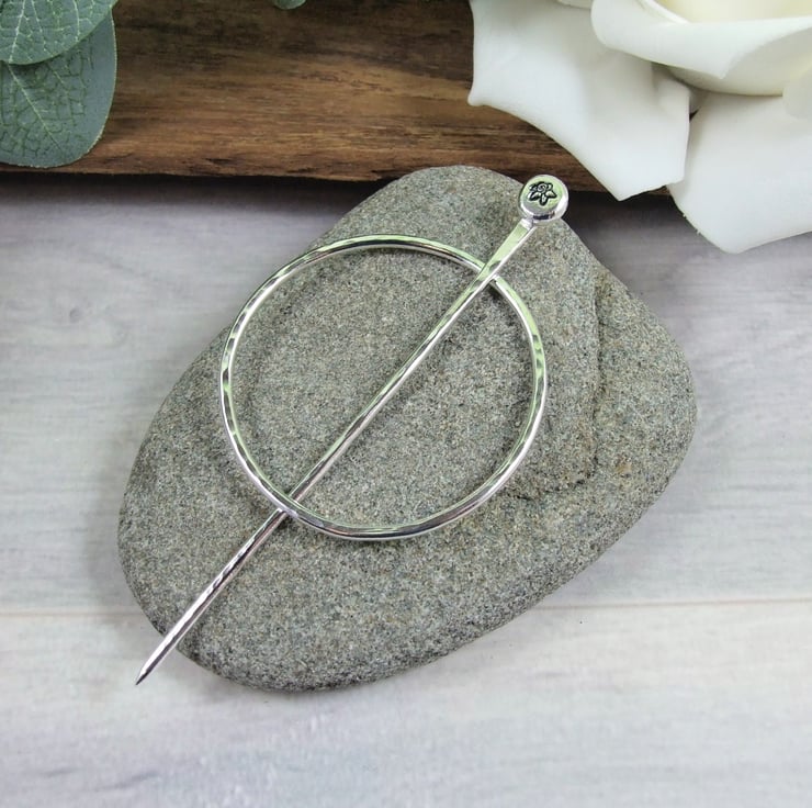 Hand forged hammered Sterling Shawl Pin withDaffodil Flower Stamped Silver Pebble Topped Pin for Open Weave or Knit Shawl, Scarf, Wrap or Cardigan.