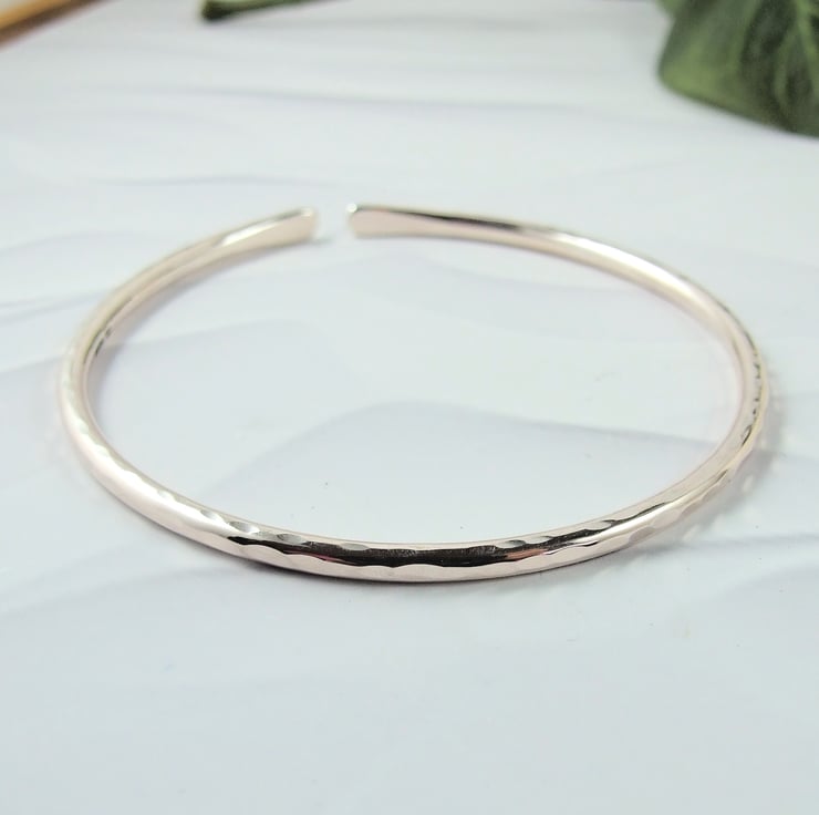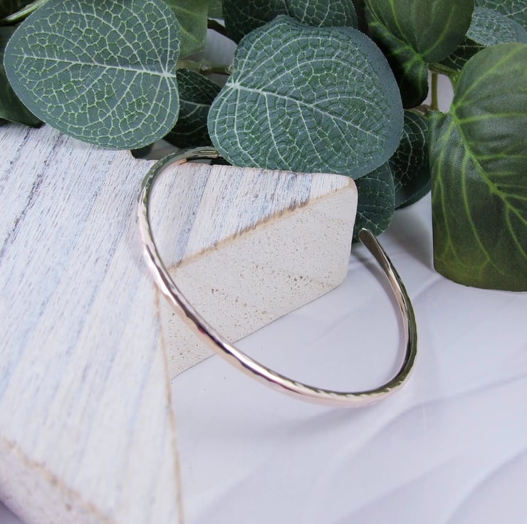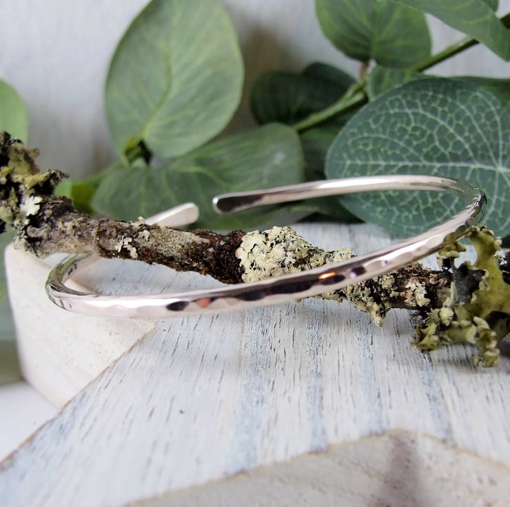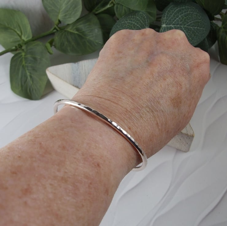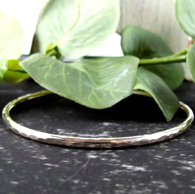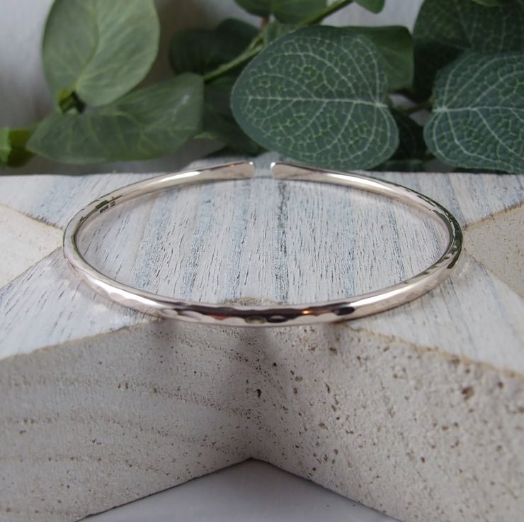 I have made the bangle from 3mm wide solid recycled sterling silver wire which I have shaped into a bangle, the ends are softly rounded and the bangle is left open. Hammered finish.