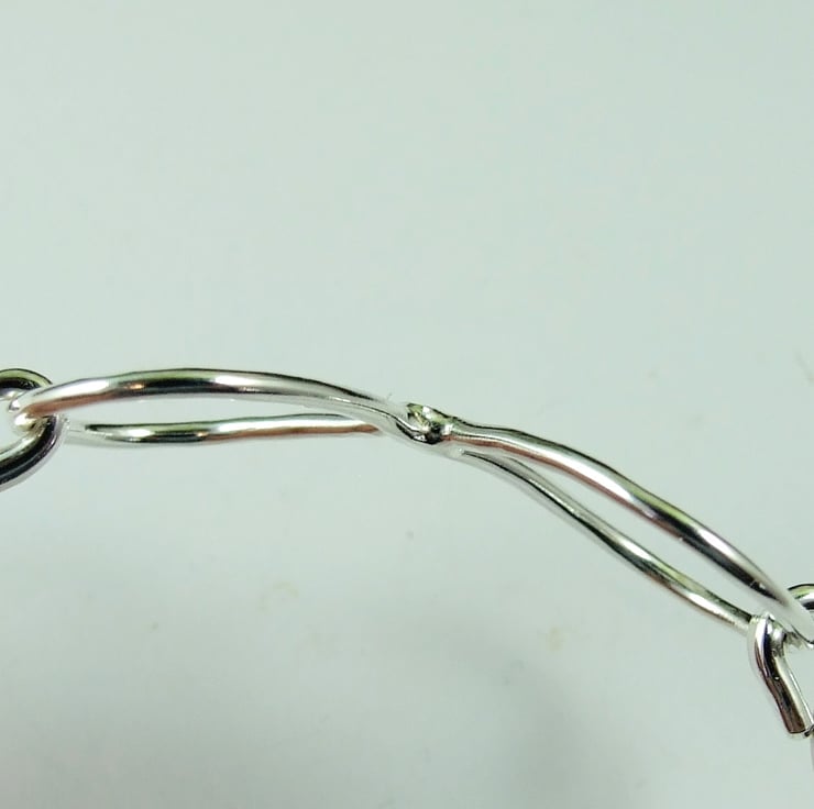 The body of the bracelet is made from 2mm solid sterling wire which I have hand cut, shaped and created the hooks to form the clasp and hinge. The infinity knot is made from 1.5mm silver wire shaped by hand and soldered. I have fixed one side of the knot to the bangle securely to form the hinge and the other forms the clasp.