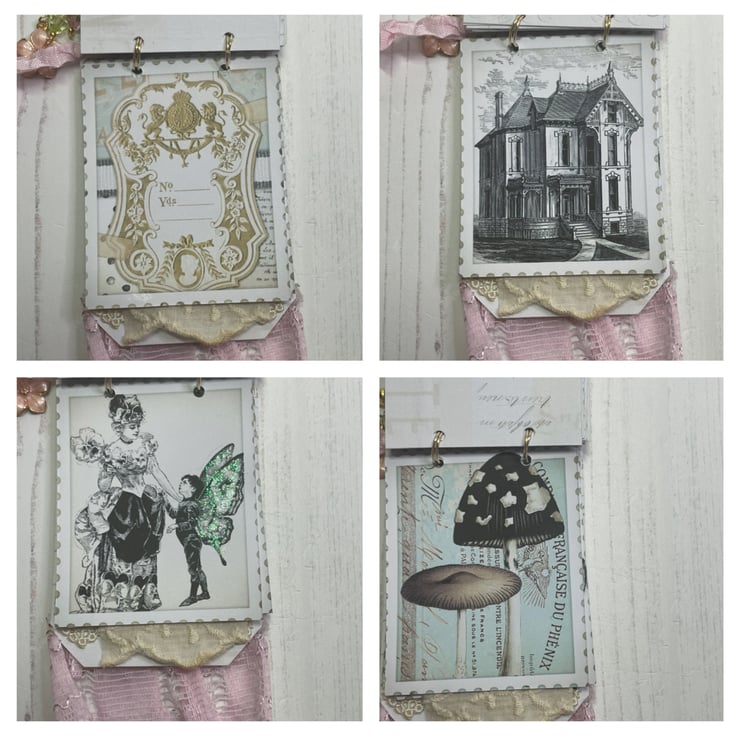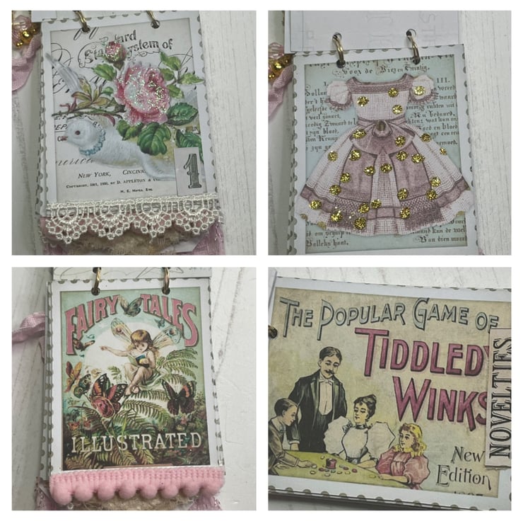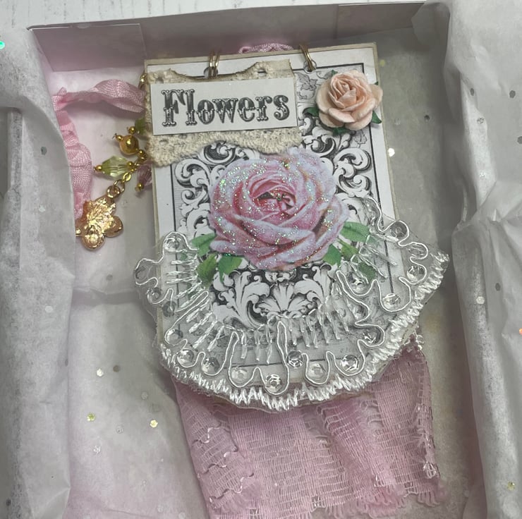 Mini rose journal with 16 pages of pretty images, some are glittered, many have lace or other edging to the bottom of the page. Words embellish at random. The front page has a lace appliqué, paper rose, charm dangle in go,d with pin faux silk ribbon. Held together on gold tone jump ringsThis book may be tiny but perfect for miniature lovers. Held in its own matching box. Measures 2.25” x 3.25” plus the pink lace on the back page.