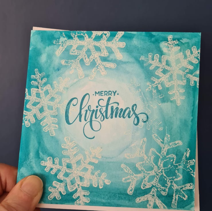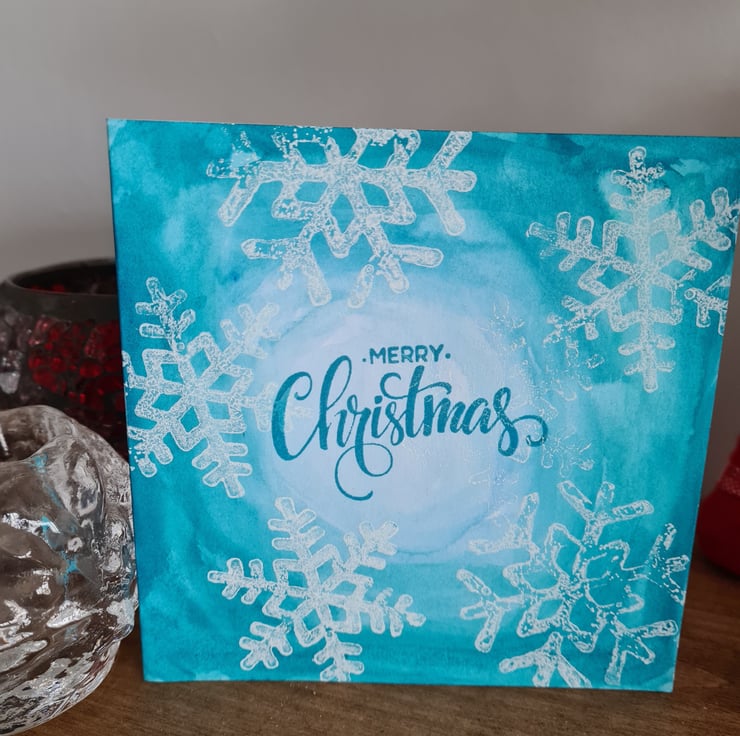 This snowflake Christmas card is handpainted in blue/teal watercolour, and stamped with white acrylic snowflakes then the text has been hand stamped to finish. It's always lovely to receive a handpainted card and this would be perfect for family and close friends.
