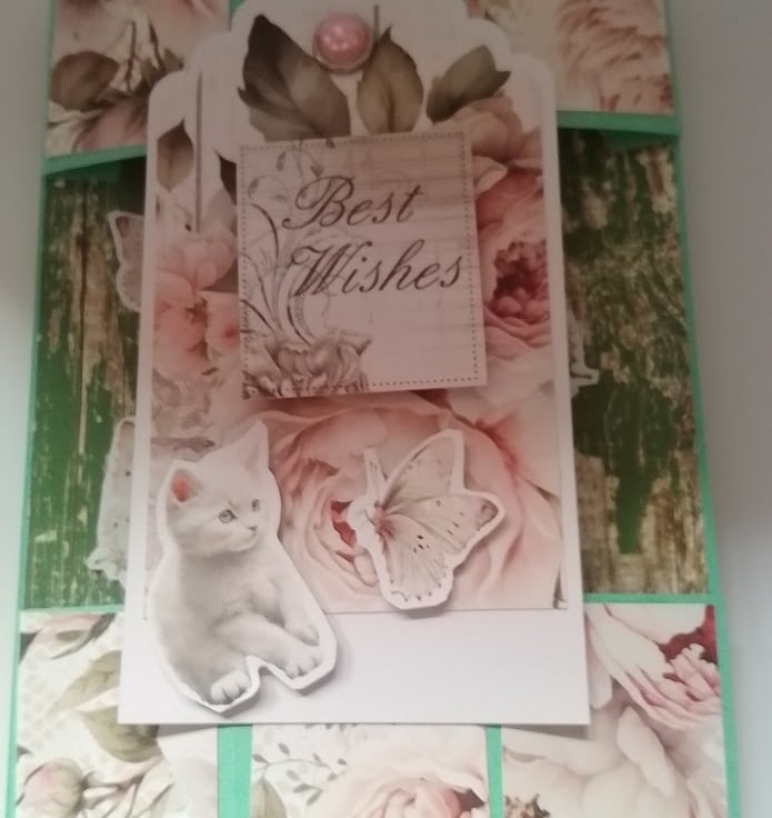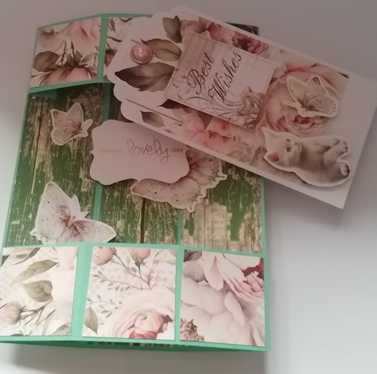 Front of card has a tag secured to top panel with a pink brad, which can be moved to reveal inside decorated with butterflies and a ' Have a Lovel Day ' sentiment. Front of tag is decorated with floral pattern paper with cat and flower ephemera mounted on foam pads. With a 'Best Wishes' sentiment mounted on foam pads.