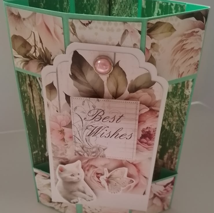 Handmade Hexagonal card, front of card is decorated with floral paper on top and bottom panels and inside with wood effect pattern paper.