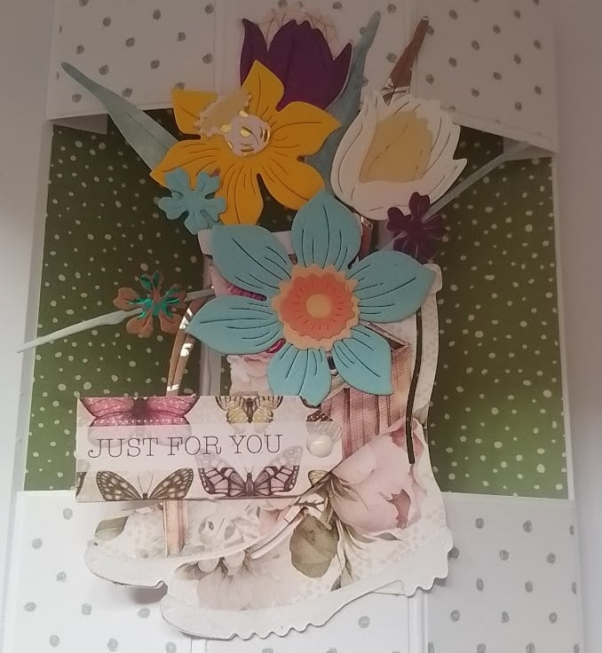 Handmade Hexagonal Just For You card, front of card is decorated with white paper with small green dots and inside is decorated with green paper with white dots. Front of card is decorated with floral wellington boots filled with handmade flowers and stems and has a 'Just For You' sentiment attached.