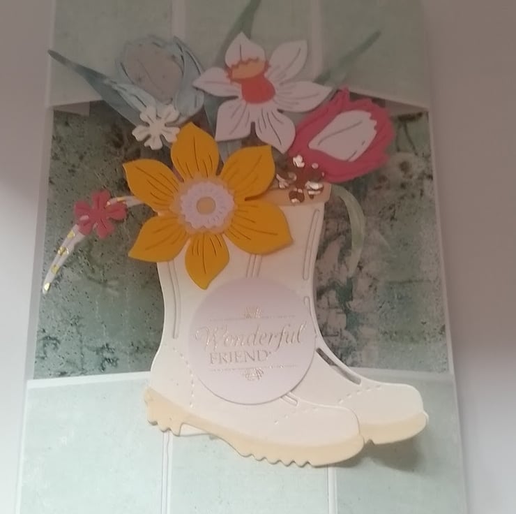 Handmade Hexagonal Wonderful Friend card, front of card is decorated with light blue paper and the inside is decorated with a darker shade of green patterned paper. The centre of the card is mounted with Wellington boots cut out of metallic white card and decorated with handmade flowers and stems.