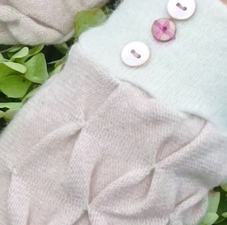 Cosy handmade felted cashmere in blue with antique lace and repurposed button. The high quality cashmere makes them so soft and extra warm. The cuffs can be folded down to extend the length. I have fully lined them in eco bamboo fleece, for extra warmth. Finished with upcycled buttons. I buy most of my cashmere from Oxfam therefore supporting charity.