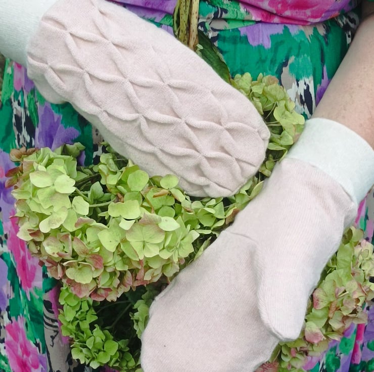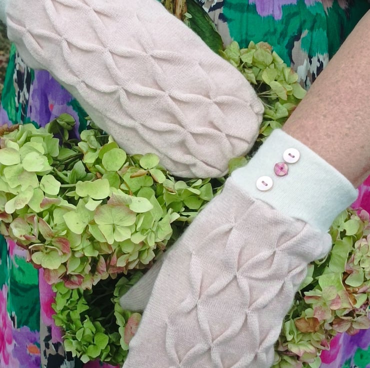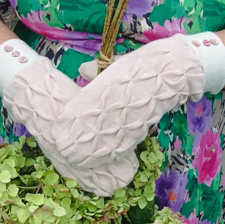 Fully lined cashmere mittens made from recycled cashmere jumpers. All my gloves and mittens are unique: they are designed and created by myself. I have a degree in contemporary crafts and like to work from sketchbooks and photographs to create patterns for Knitting and crochet. I particularly love to use high quality and luxury yarns in my designs as they give them a feel of absolute luxury.