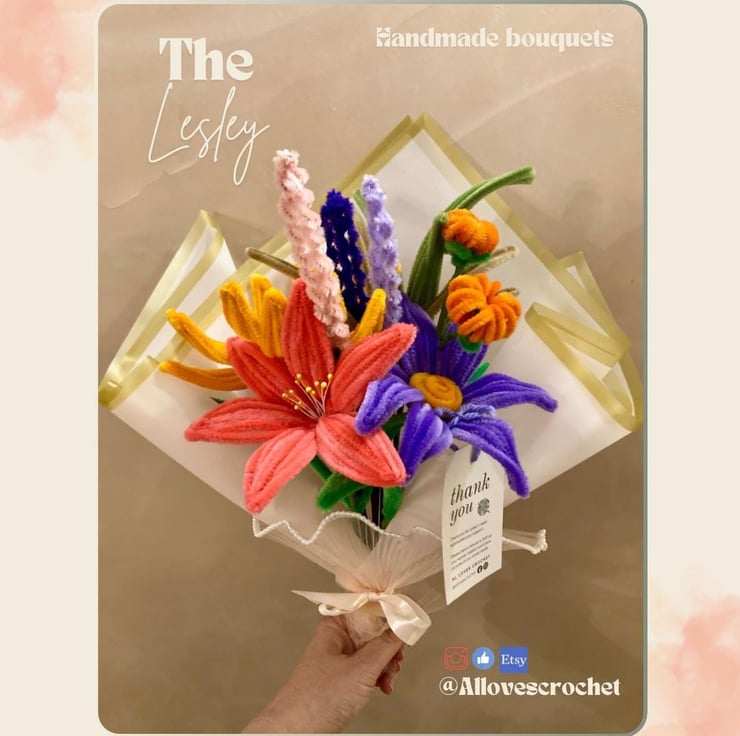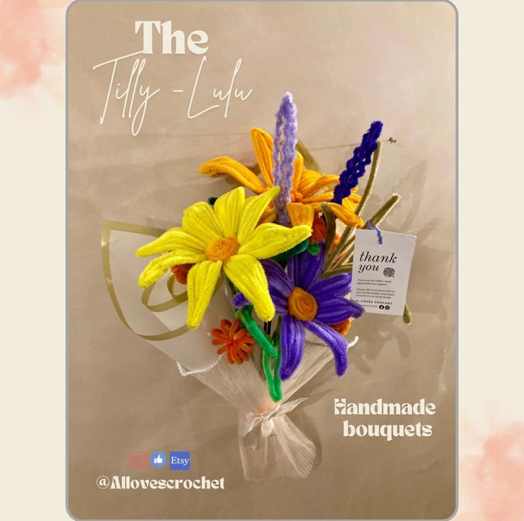 Handmade everlasting bouquets made from Pipecleaner twiststick designs. Each bouquet has 8 stems ranging from large flowers to smaller buds and foliage. This is a beautiful option for someone special who loves flowers but hates them dying!