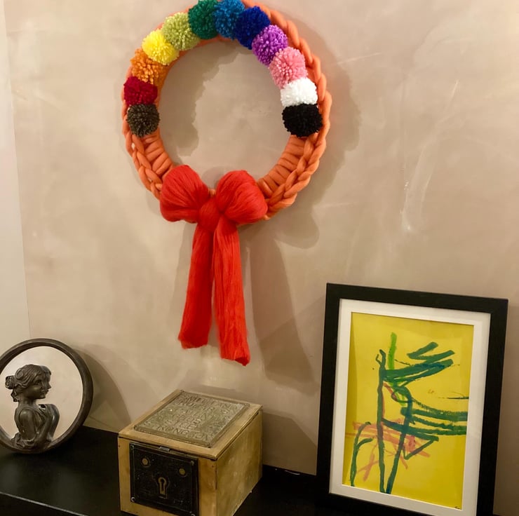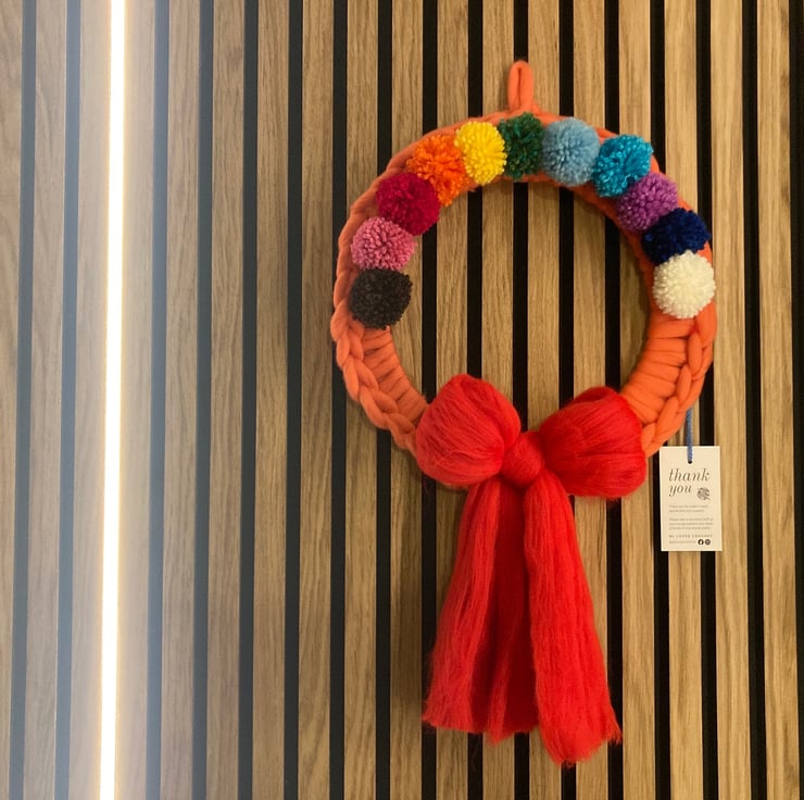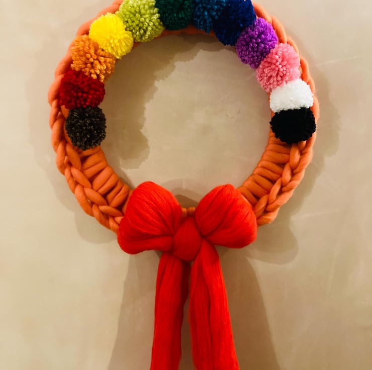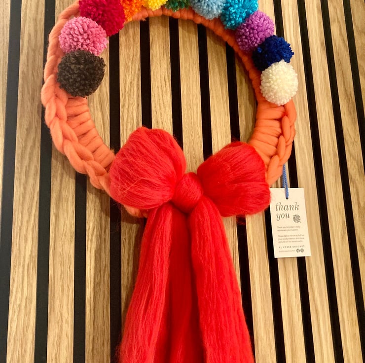 A reusable woolly wreath that will look stunning on any door. Made with finger crochet, pom-poms and chunky squiggly yarn to order. As this is made with pom-poms, placement and colours can vary slightly to the main picture. Please message if you have different colour requests.