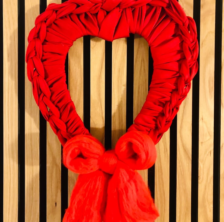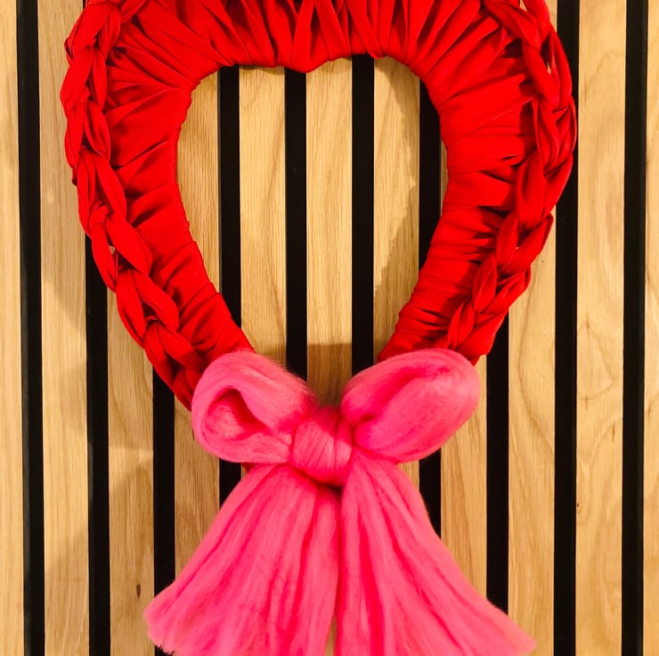 This hand crocheted ribbon heart wreath will look beautiful as wall art all year around, as decoration for Valentine's day, a proposal, at a wedding or to show someone special you care.