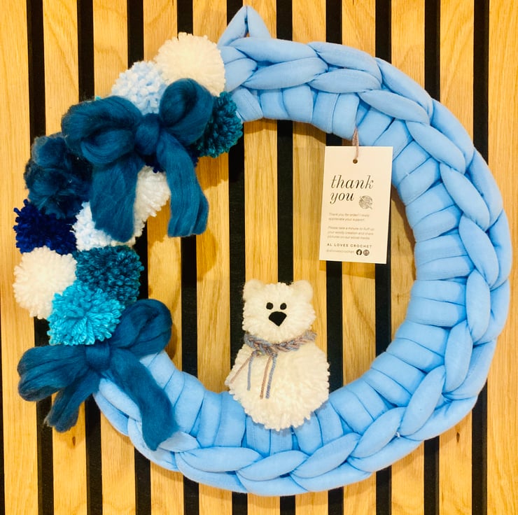This hand crocheted woollen wreath will look beautiful as wall art all year around or as decoration for a baby shower.